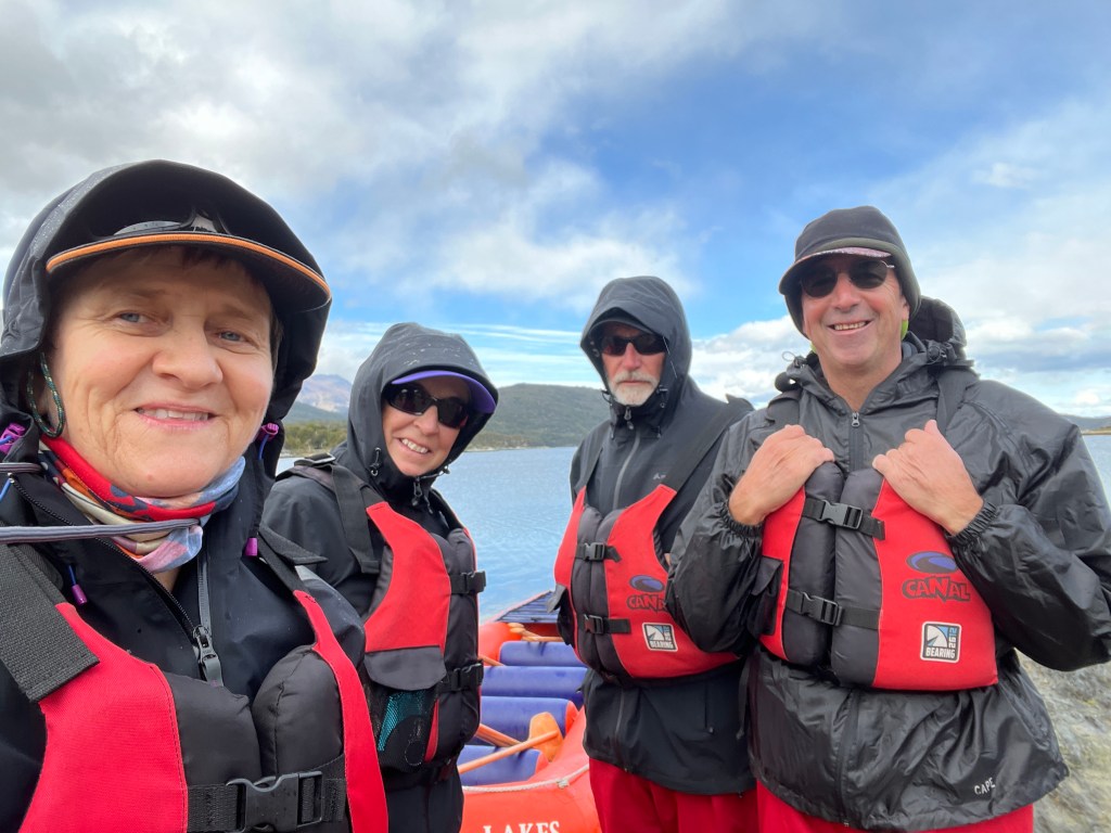 After lunch the rain had set in, light but windy and cold. It looked miserable for canoeing, but off we went back on the bus, stopped at NP loos for the second time, then onto the lake. Here were two inflatable rafts. We were given gum boots and questionably waterproof over pants. Coats on, cameras etc on the bus. We broke into two groups- Spanish speakers and English speakers (plus one guy from Buenos Aires for even numbers). Our guide was Mari, and our walking guide Caro was with the other boat.
