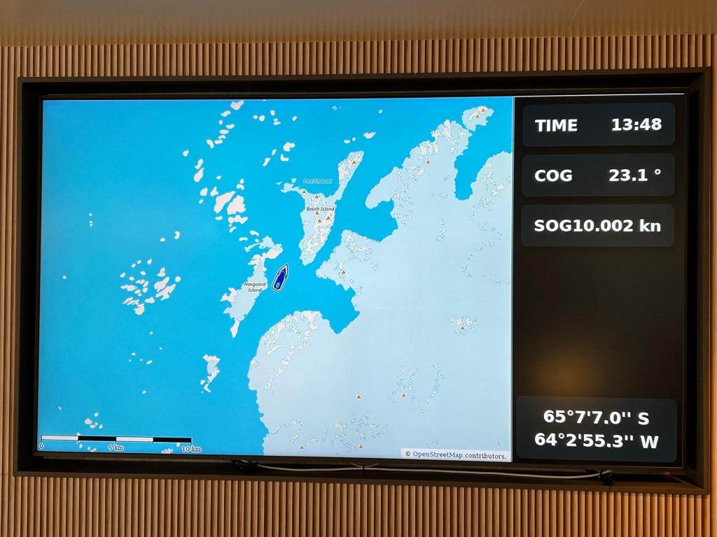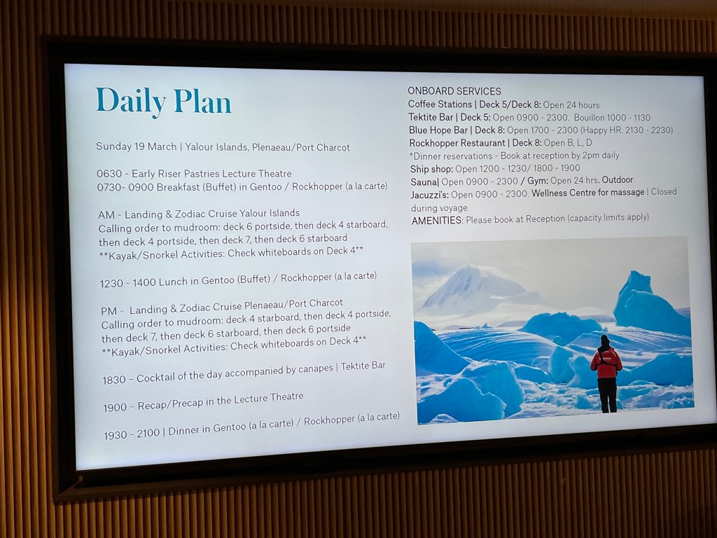It’s also important to check the board for the Daily Plan for the next day. Turns out we only had a short journey during dinner to arrive at our destination for tomorrow – Goudier Island/Jougla Point in the morning. So a quiet night hopefully.