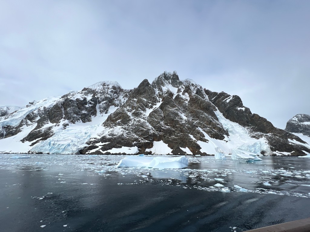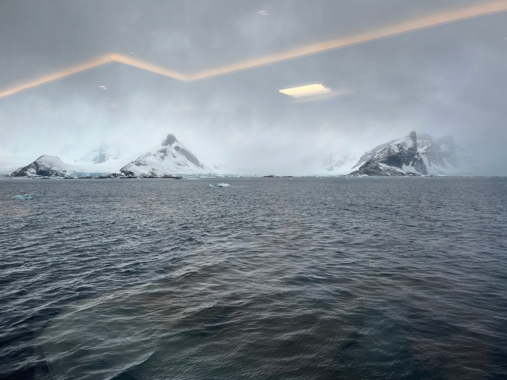 Back on ship to await the return of last zodiacs before weighing anchor to head through the most spectacular Lemaire channel. We kept our landing warm clothes on on Howard’s advice. What a trip! The channel is flanked by meringue like glacier topped mountains with rock the colour of chocolate ripple bickies. Many people both passengers and crew were out on deck to watch the trip down the channel. At the end it was hard to see how the ship could get out with icebergs everywhere, of course they wended their way through.