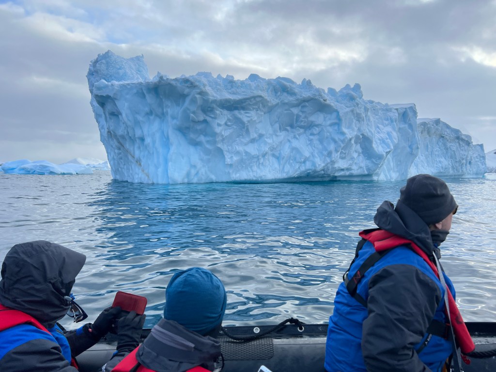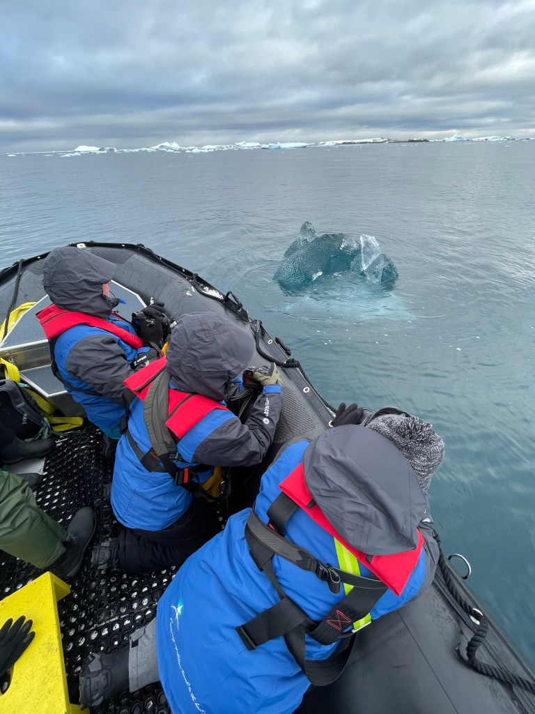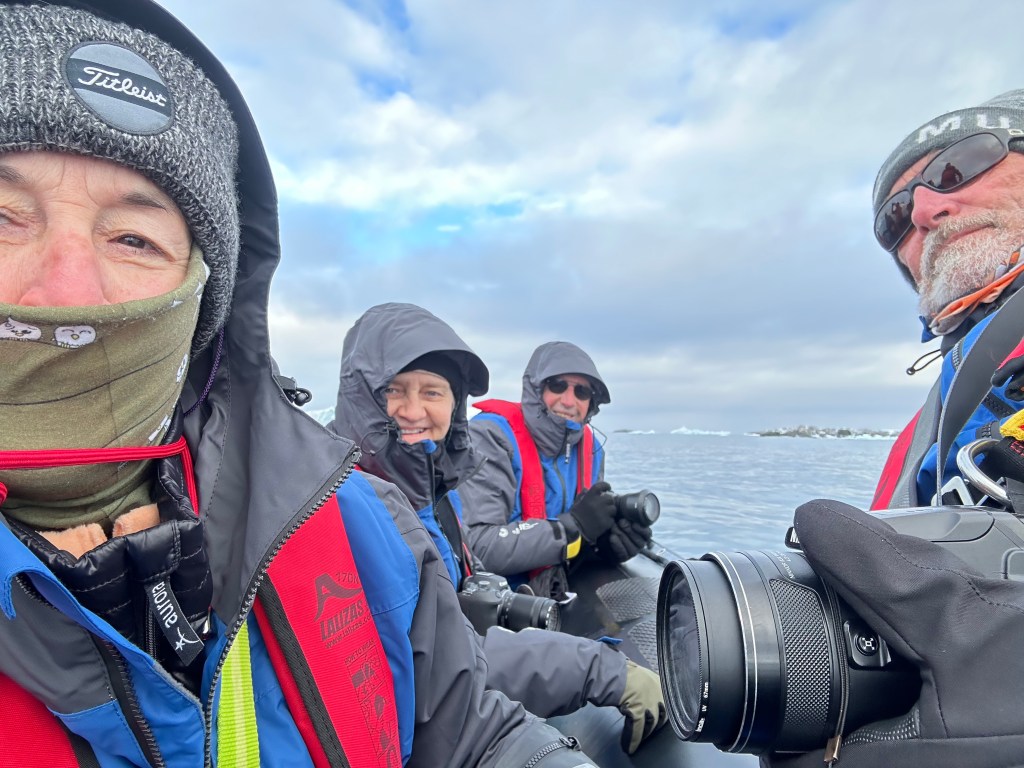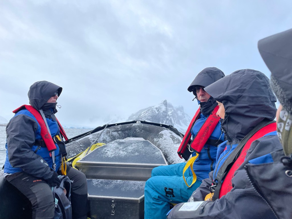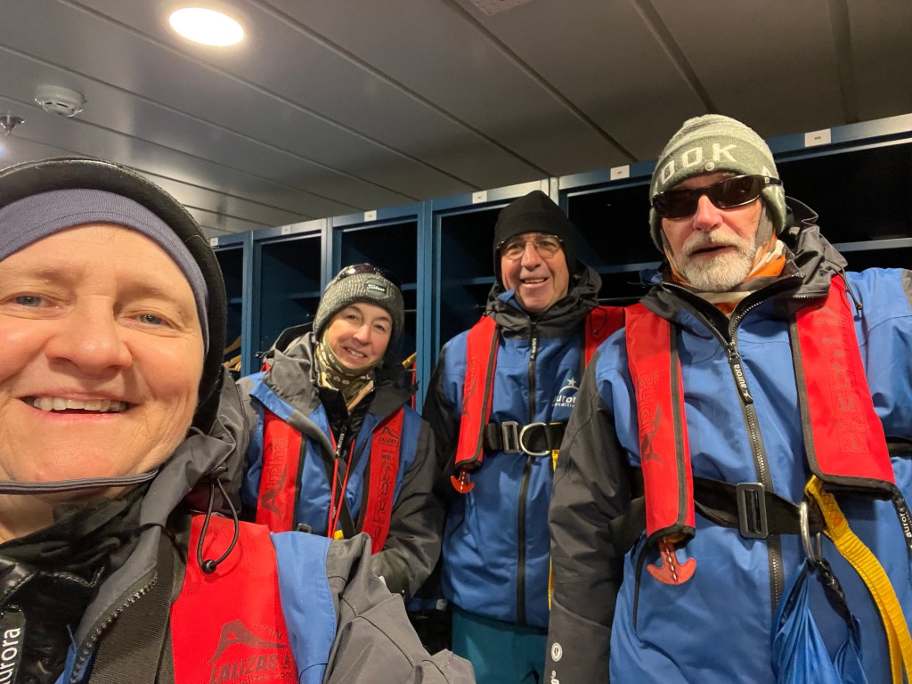 We meet up for breaky then back to cabins to get our outside landing gear on. Thermal socks, pants and top, with layers of clothing on top. For me I just have thermals and water proof ski pants with thermal socks and thicker merino socks ( thanks AP.) On top thermal long sleeve, merino tshirt today and merino long sleeve top, then the jackets provided by Aurora – down jacket and overcoat. A merino neck buff/Shute, merino beanie, polar fleece beanie, merino liner gloves and waterproof gloves as well. In the mudroom we ditch our shoes in our little locker and add ‘muck boots,’ basically very good gum boots. When moving around on landings it’s very warm, but any wind or moving in the zodiacs and it’s cold. The fingers are the worst – holding on to very cold cameras exacerbates the cold.