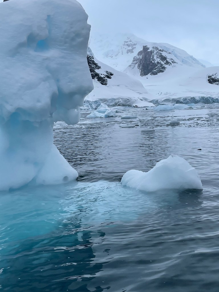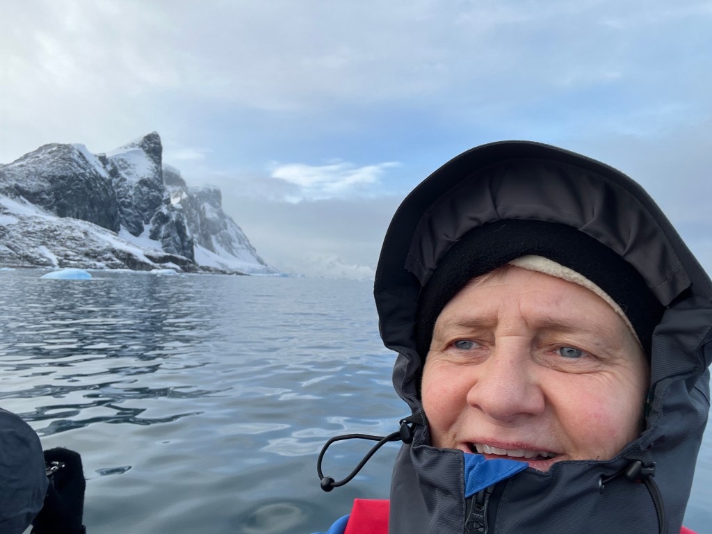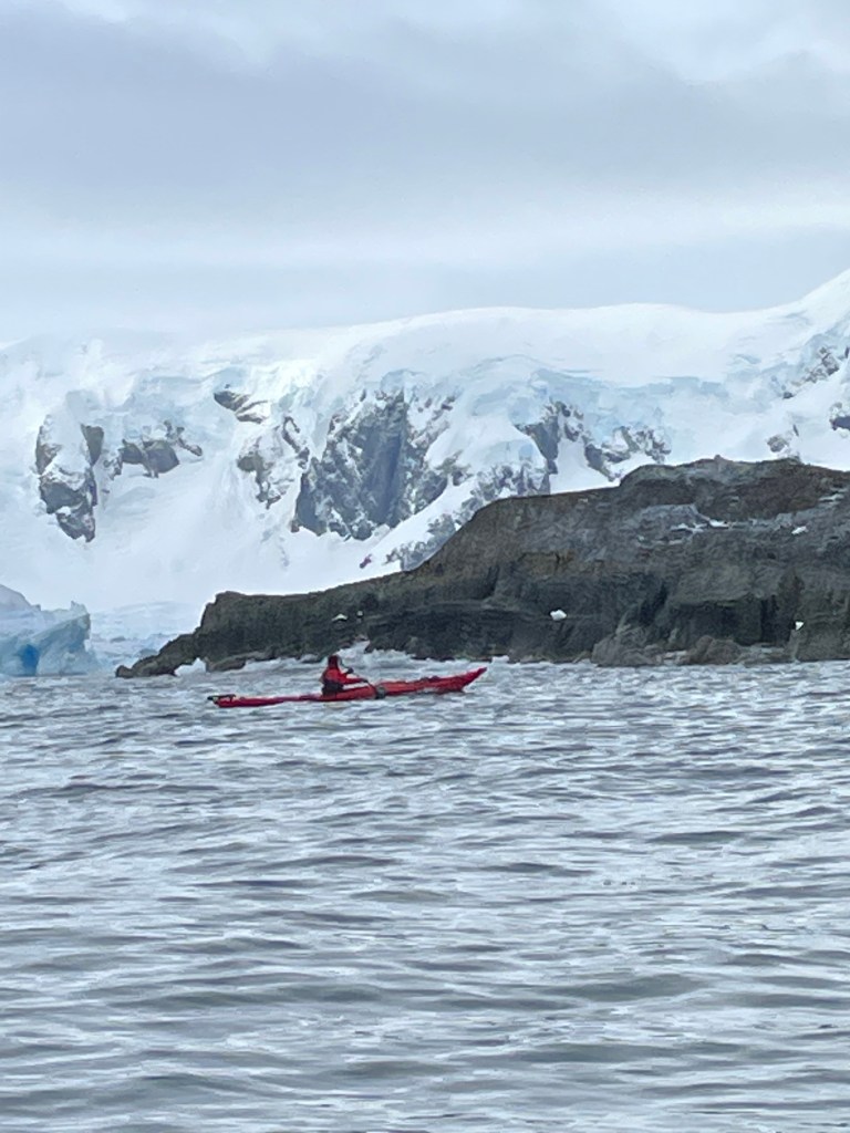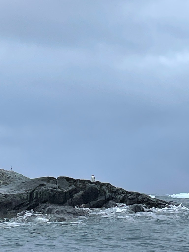 Back to ship for lunch and then we were sailing down an amazing channel with towering mountains and snow/ice capped glaciers. Then it was time to get ready for PM landing at Port Charcot and zodiac cruise around the grounded icebergs of Pleneau Channel. The landing at Charcot had us land and walk up to view a colony of Gentoo penguins with some Skuas and giant petrels , a seal or two, there was also an view into a bay of icebergs. We landed on rocks with towels laid down to walk on. After the walk to the penguins we walked a little way in the other direction with a view of more penguins and birds. There was a longer walk up to a commemorative cairn on top of the hill but we didn’t have time before needing to be back for our photography zodiac cruise with Max – again many icebergs, porpoising penguins, crabeater seals, Skuas, gulls, Antarctic terns, Cormorants or Shags.