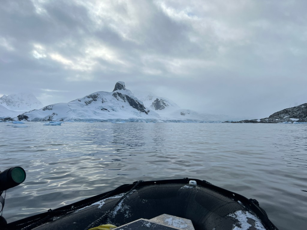 Due to the wave action on Yalour Islands the landing was cancelled and we had a longer photography zodiac cruise with Max. We ticked a few more things off the list – Gentoo Penguins, Humpback whales, crabeater seal, Phil saw a leopard seal in the water too, along with icebergs, icebergs and more icebergs. Again there was snow as we left the boat but then it stopped and we had pretty smooth seas for the zodiac cruise.