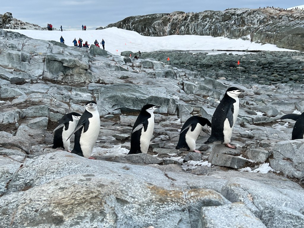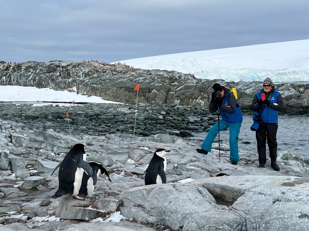 The island is home to several colonies of Chinstrap Penguins. Stephi shared that they are adults who are here to ‘catastrophically moult.’ They need their feathers to be perfect and waterproof for their life at sea, so they have to do a full change before they can swim and hunt again. Penguins actually live at sea, coming to land only to breed and moult.