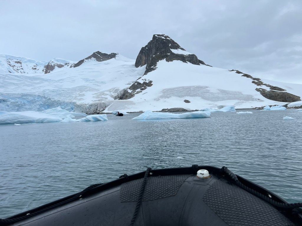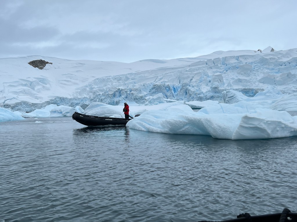 Then we had a short zodiac cruise with Vicki at the tiller and Julia providing advice – both these ladies have spent a season at Penguin Post Office at Port Lockroy. There were yet more stunning icebergs and views of the glacier and ice cracking off the mountain side. It fair dinkum looks like cracked sheet of meringue.