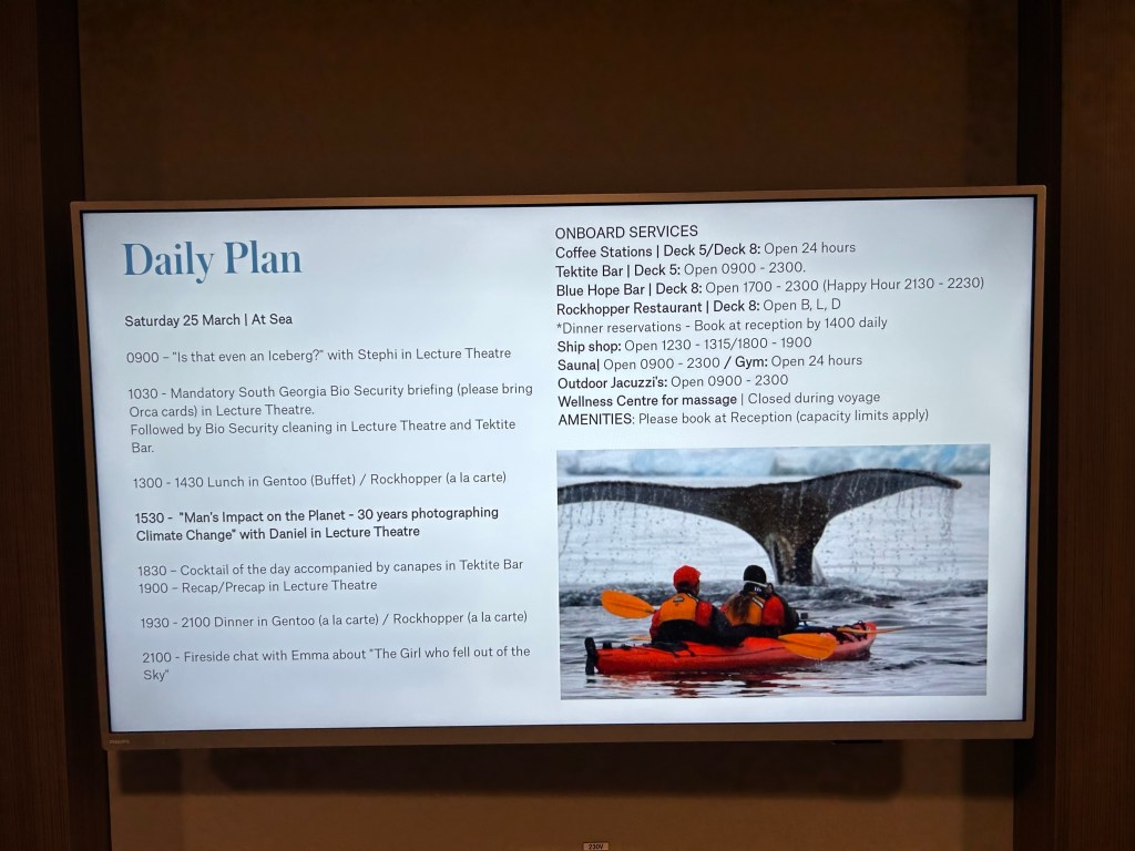 Next task is our mandatory bio-security briefing and check/clean of our outdoor clothing in preparation for landing at Sth Georgia. Video: A visitors guide to Sth Georgia narrated by David Attenborough.