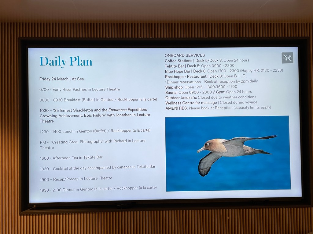 Had a quick shower, breaky, a little time to phaff before heading down to Deck 5 lecture room for another Jonathan Lecture. This time ‘Epic Failure, Crowning Achievement: The life story of Ernest Shackleton.