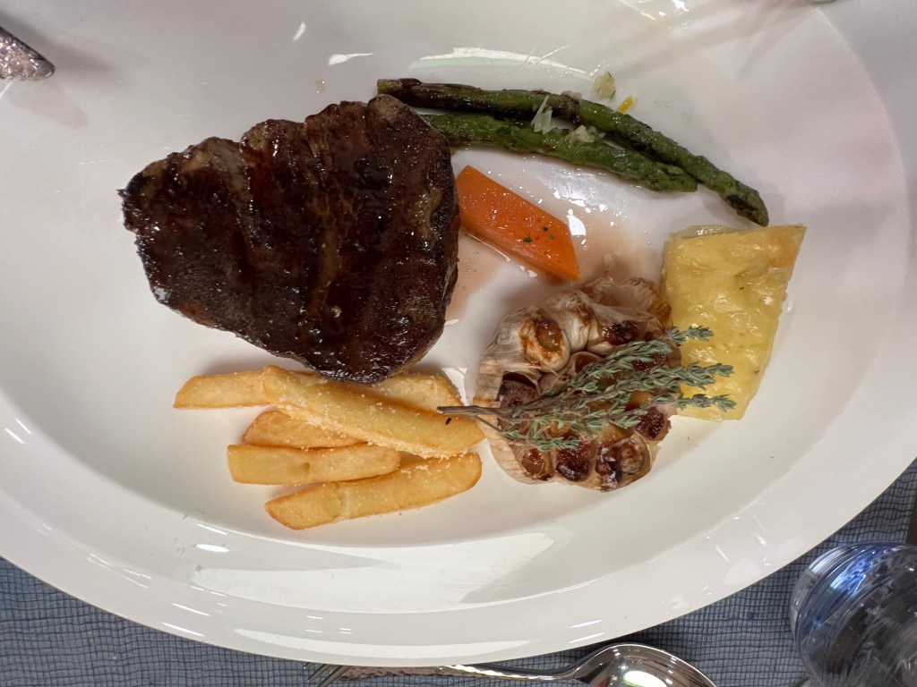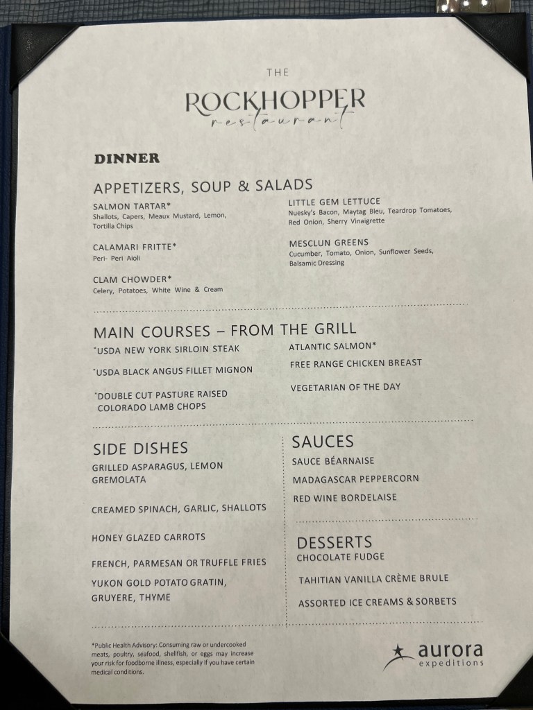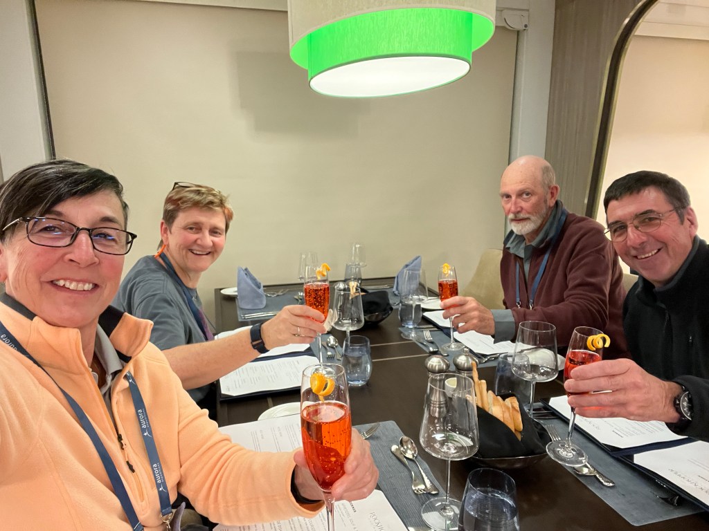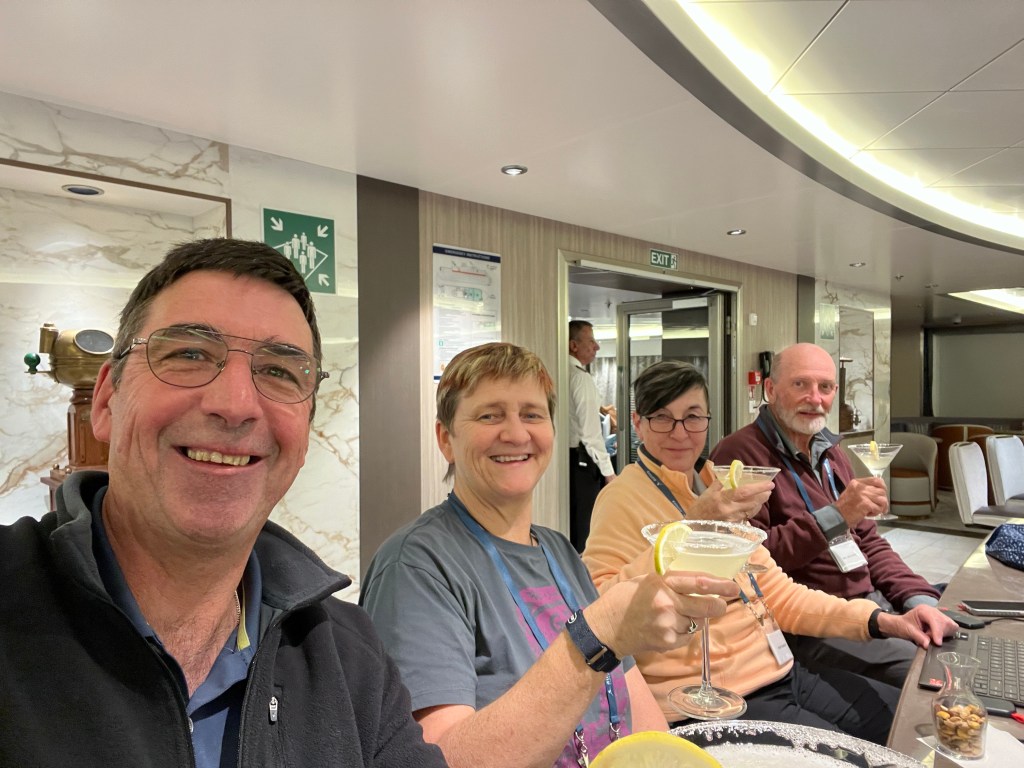 Tonight we ate dinner at Rockhopper Restaurant up on Level 8. It was magnificent. A choice of a couple of steaks, lamb chops, chicken and delicious sides. There was only us and Francesca indicated that the only other booking is the Captain and Hotel Manager. Sometime later Captain Artem arrived with 2 of his officers and Dr Sophia and they were joined by Osman and Pech (we learnt a couple of days ago at lunch in Rockhopper that Pech shares a cabin with her husband) when we enquired who it was she told me it was Osman, they met in Thailand and owned a small hotel in Bangkok. They were doing ok until COVID hit. Now they are both back on ships. This is the first time they’ve been on same ship.