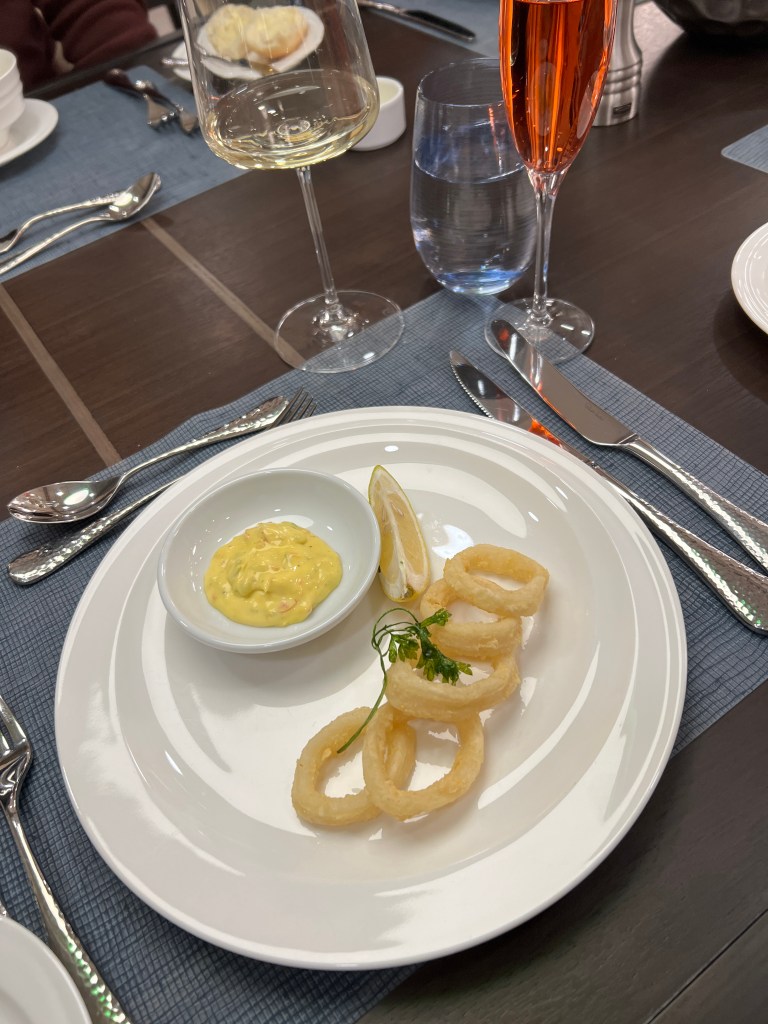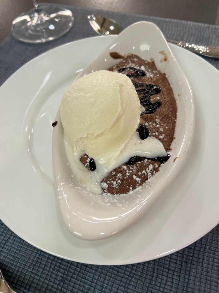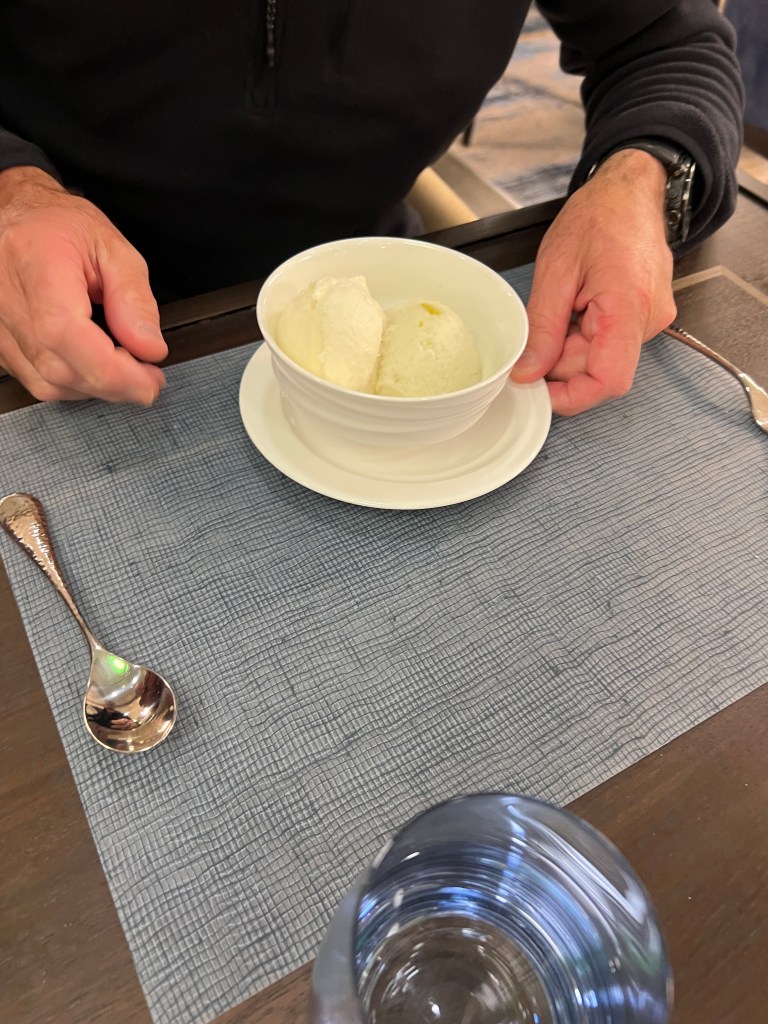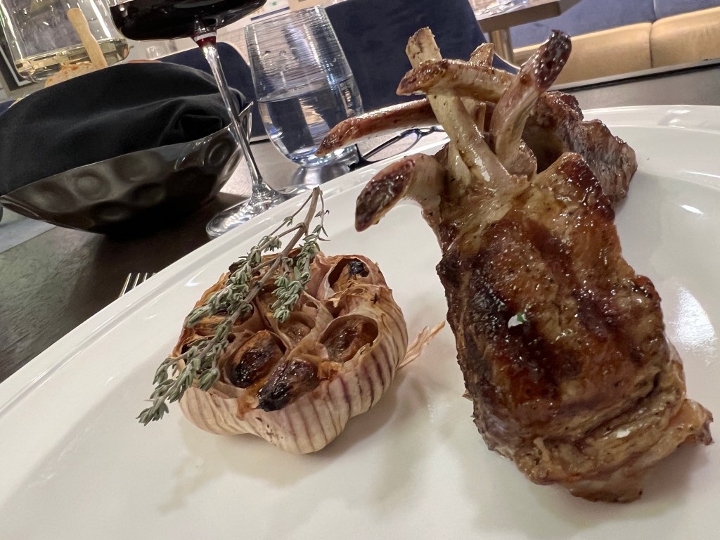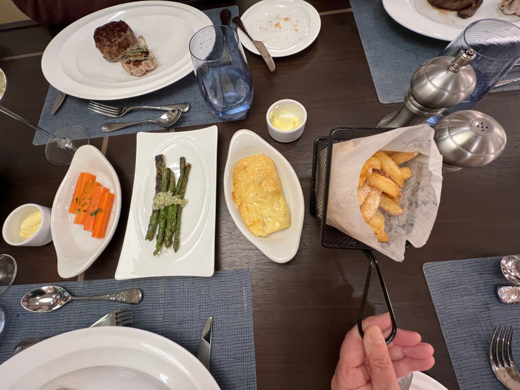 Tonight we ate dinner at Rockhopper Restaurant up on Level 8. It was magnificent. A choice of a couple of steaks, lamb chops, chicken and delicious sides. There was only us and Francesca indicated that the only other booking is the Captain and Hotel Manager. Sometime later Captain Artem arrived with 2 of his officers and Dr Sophia and they were joined by Osman and Pech (we learnt a couple of days ago at lunch in Rockhopper that Pech shares a cabin with her husband) when we enquired who it was she told me it was Osman, they met in Thailand and owned a small hotel in Bangkok. They were doing ok until COVID hit. Now they are both back on ships. This is the first time they’ve been on same ship.