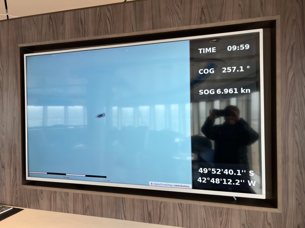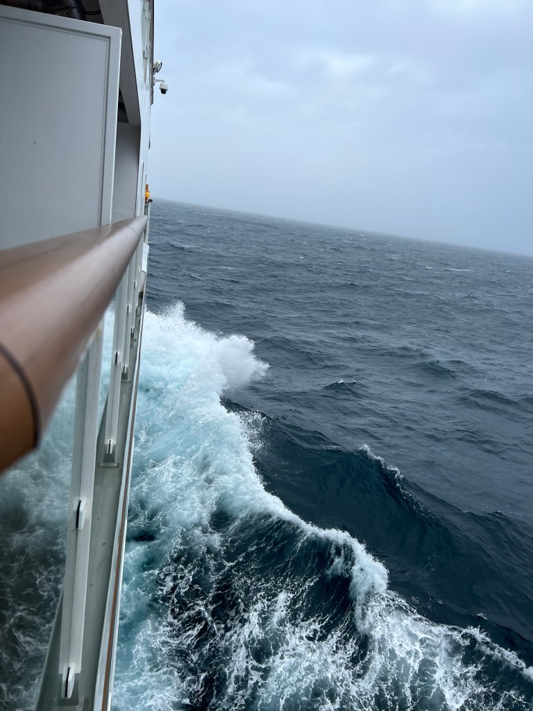 Big waves today but we have turned West into them. I have some videos which I hope captures the movement of ship. (Just haven’t worked out how to upload them to blog)