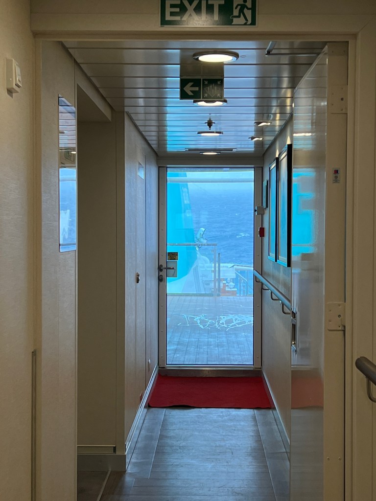 I’ve been out on deck a couple of times to watch the rough seas. After lunch most doors to outside were not able to be opened due to bad weather. Our balcony is still ok. Not as cold, but wet and windy.