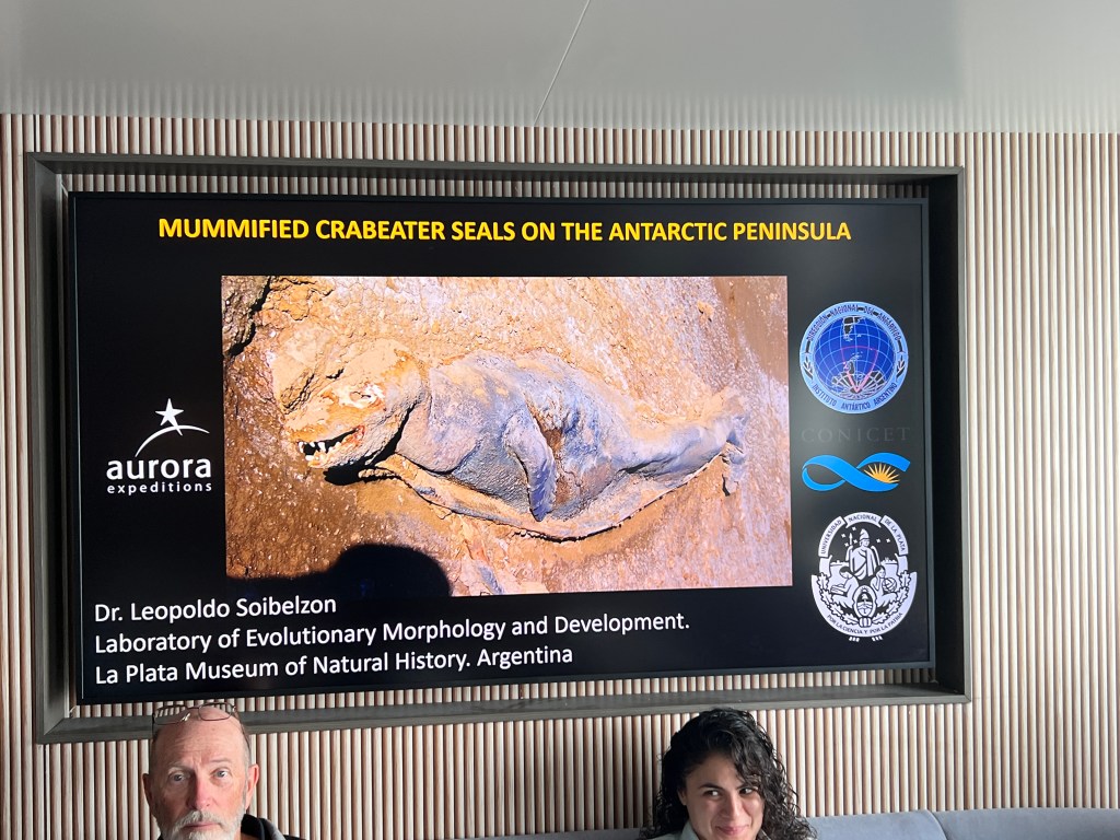 Leo lecture today ‘Mummified crabeater seals on the Antarctic Peninsula’ quite interesting that these seals are stranding in high dry places and dying of either starvation or brain damage from jumping off high cliffs. Leo and team carried out autopsies and he described how hard that was as the seal skin is thin and hard, (and frozen) it was really hard to cut. He described using power tools and that just meant rotten skin, flesh etc melting and flying all over the place and stinking.