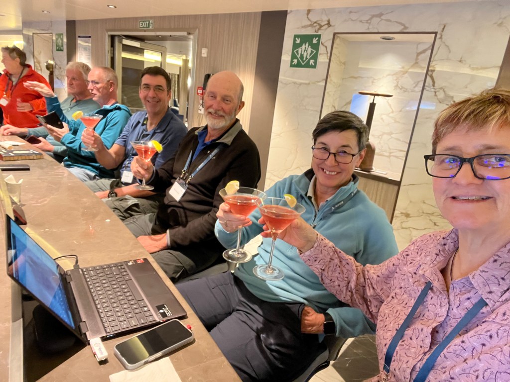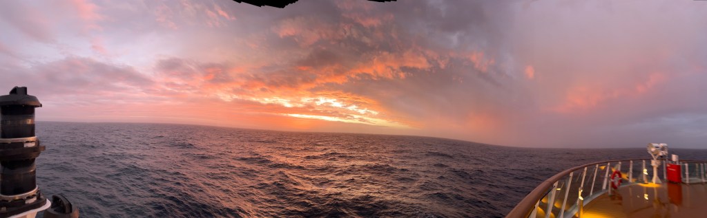 At dinner tonight as the ship ducked and weaved through waves we could see the 1/2 moon quite brightly bouncing around in the sky. There were stars to be seen from the balcony which is the first we’ve seen for a while. Between that and a pink sunset, hopefully we are in for a good days sailing for tomorrow’s Sea day.