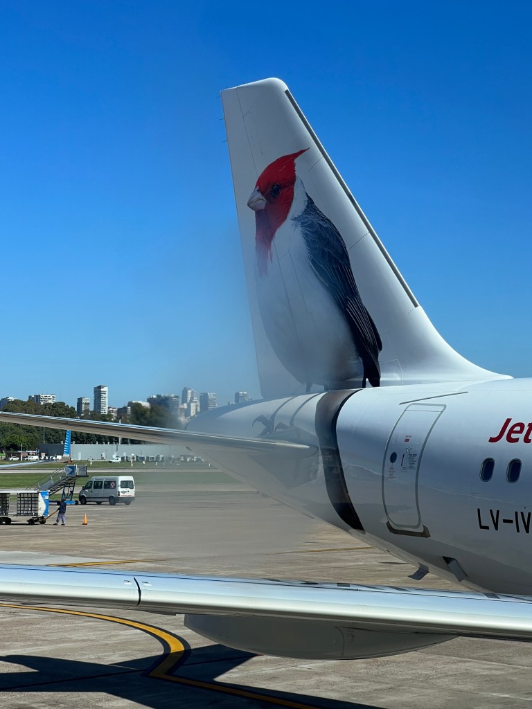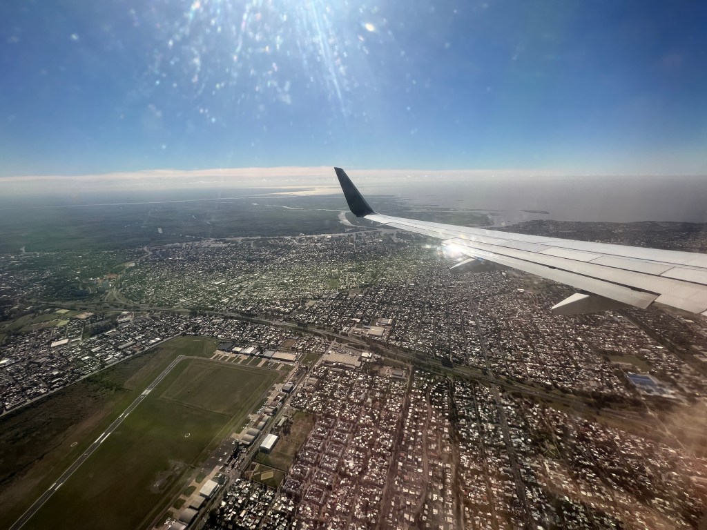 Actually boarded and took off early and landed 20 minute early. A good flight, sat next to a Dad and young daughter returning to La Plata from 3 day holiday.