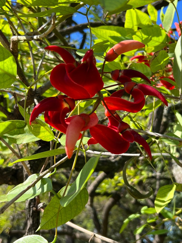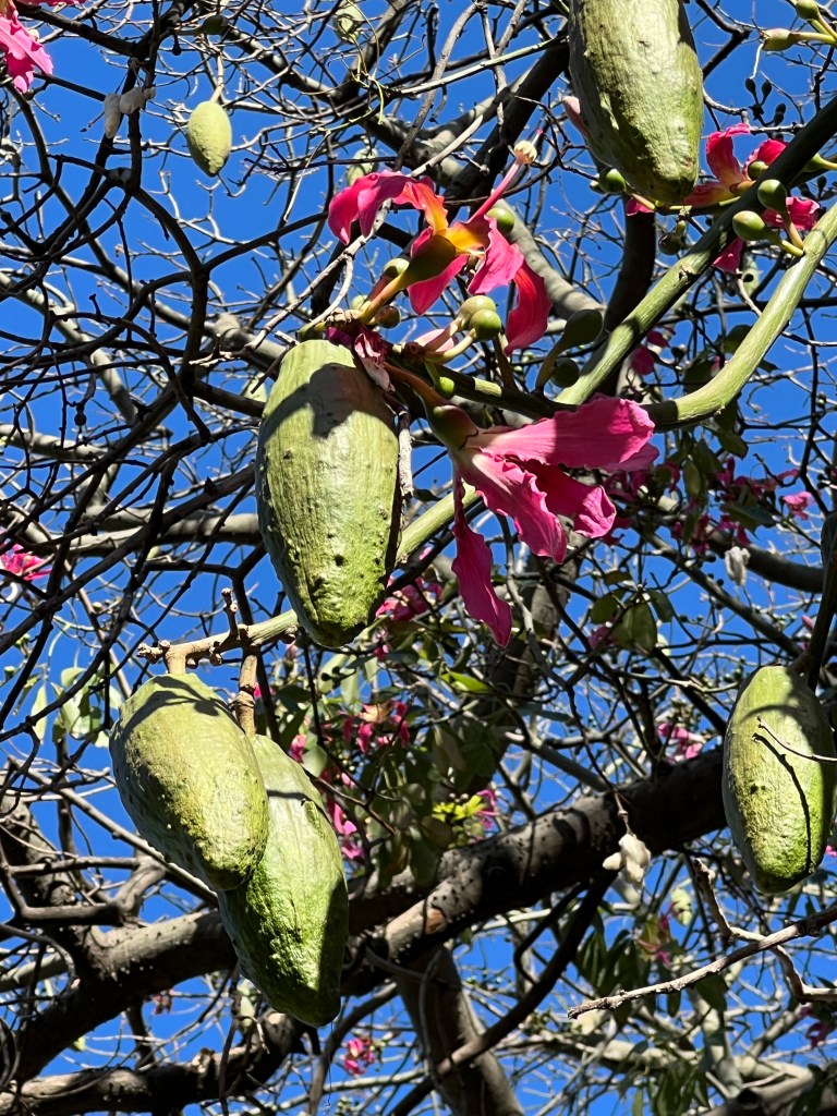 • Trees with lovely pink flowers and huge green seed pods