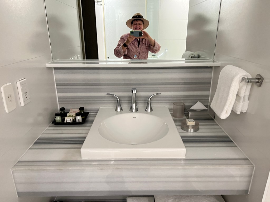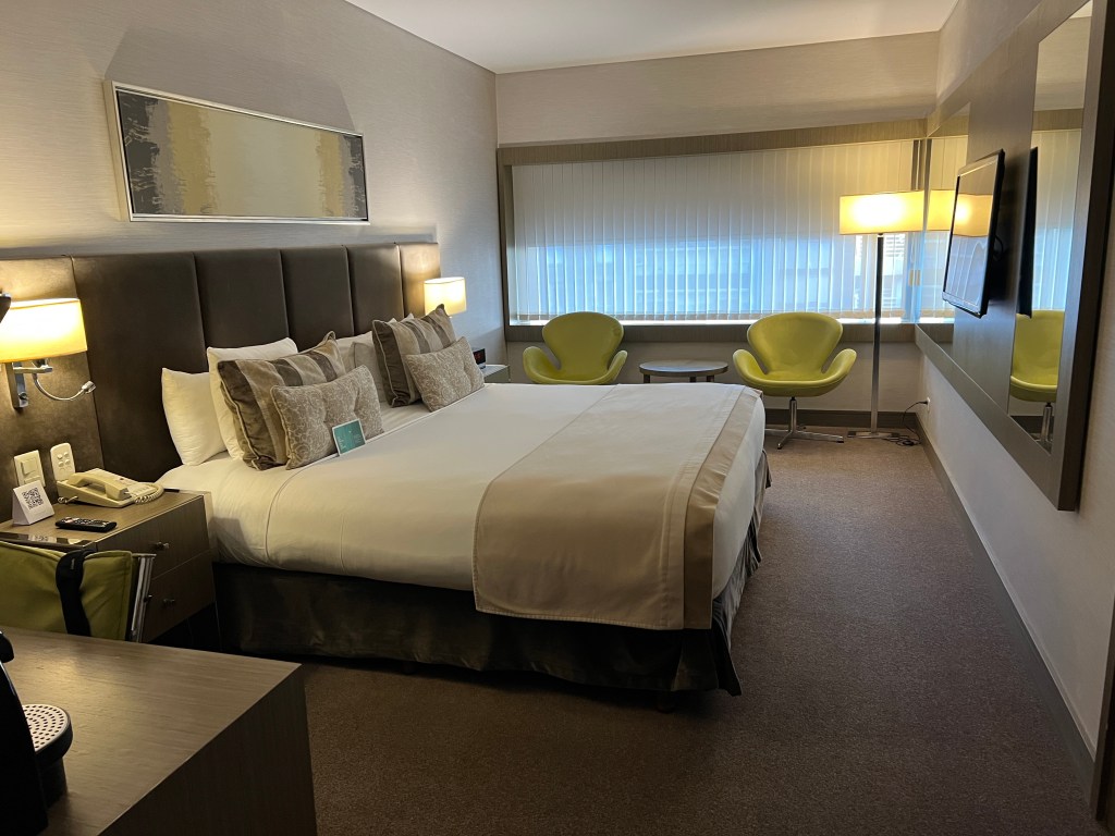 Checked in to find I have a monster of a bed on the 8th floor. More pillows on the bed than Adairs. Electronic blinds. A view into the back balconies of many apartments, spaghetti like electric and other wires too.