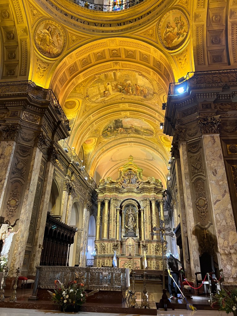 Along with the Government buildings around the square there are two churches – The Cabildo – a colonial building from the days of spanish rule and secondly the key Catholic Church – Catedral Metropolitana de Buenos Aires – is here too – the main focus was Virgin Mary rather than Jesus. This one has a lack of solid gold and sliver and marble as Argentina is devoid of such natural resources. Much of the decoration is painted to look like gold and marble. We went into this one.