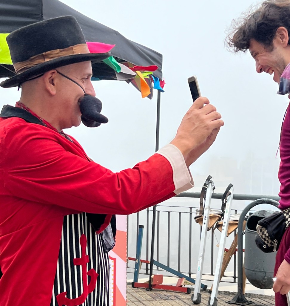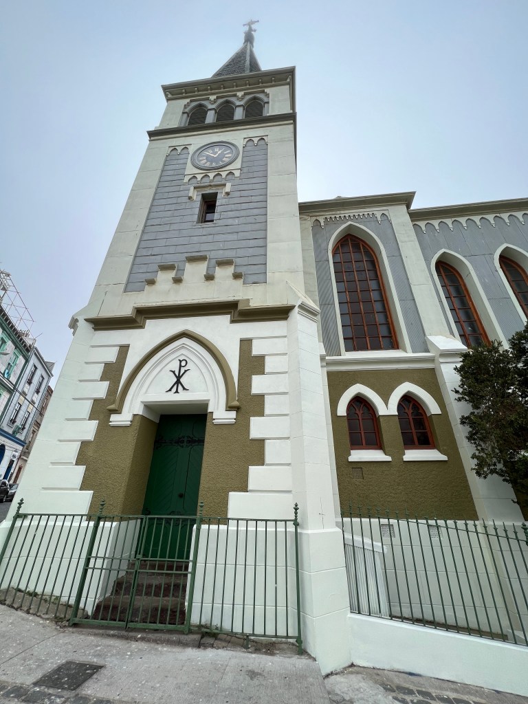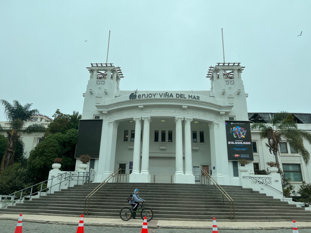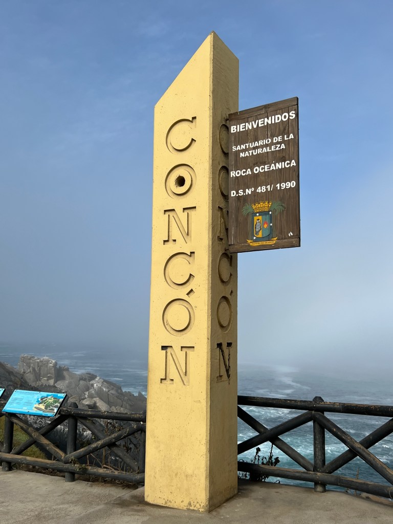 Mid to late afternoon we returned to Vino del Mar for a very tasty seafood lunch at a fancy restaurant in a castle overlooking the bay which we couldn’t see well this morning in the sea fog.
