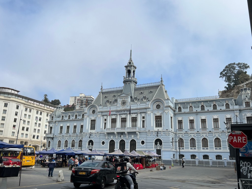 Valparaiso houses the main port, which is shared by the Chilean Naval Armada and a commercial port. The city began life as a fortress with the hills containing cannons to protect the port. The houses are built in almost ramshackle fashion up the hills with no space wasted. Along the flatter area close to the harbour there are buildings of all styles from the very multicultural history.