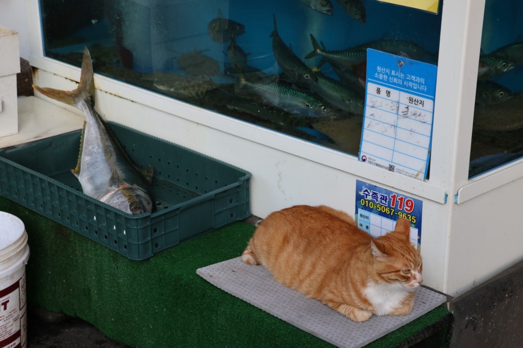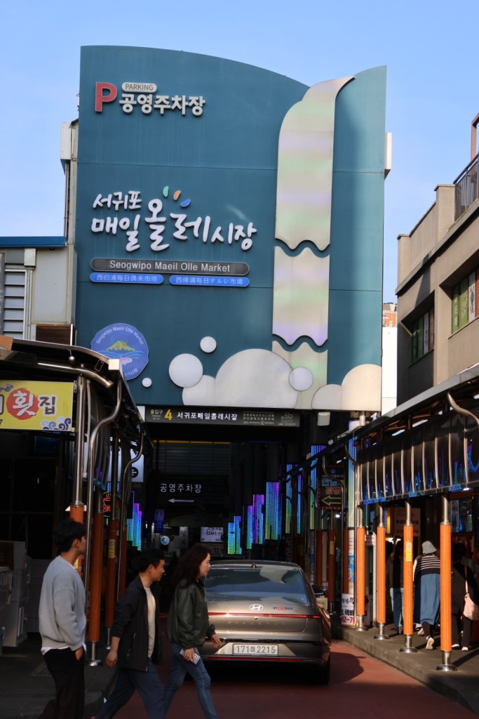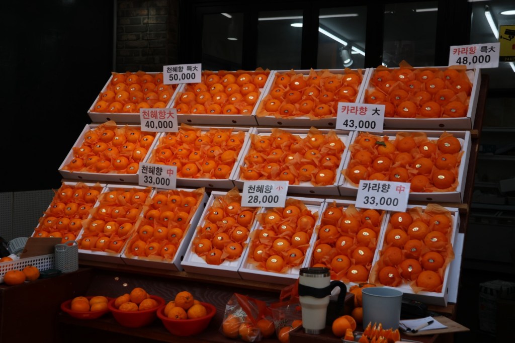 Two stops before days end. Firstly Seogwipo Maeill Olle Traditional Market. A very clean market with lots of citrus stalls. We are seeing citrus trees all over the island – grapefruit and we assume some mandarins, oranges and tangerines. We purchased 3 of two types to try tonight.