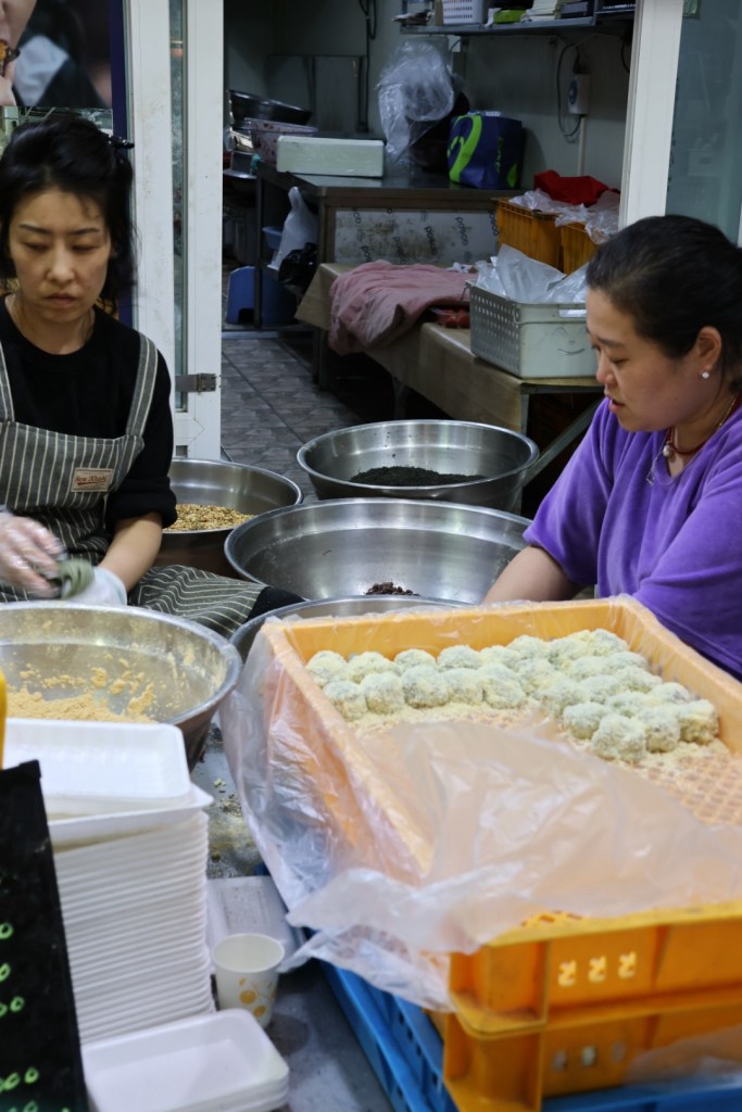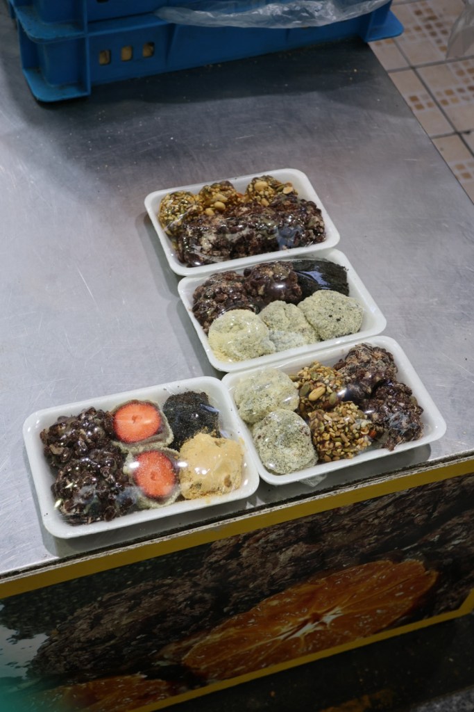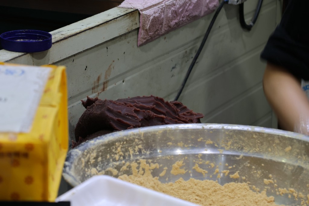 I saw two women making some sort of ball – with bean paste in the middle of a green type of doughy substance then dipping in yellow bean substance. Bean paste is in almost everything so it was good to see it as a paste.