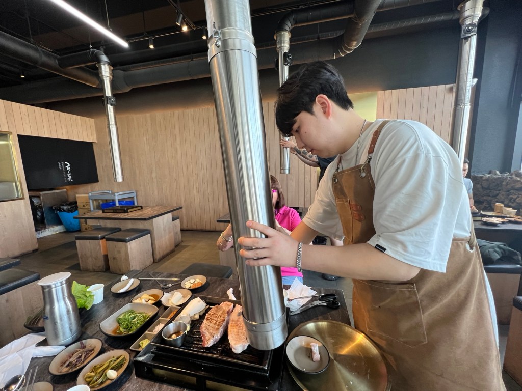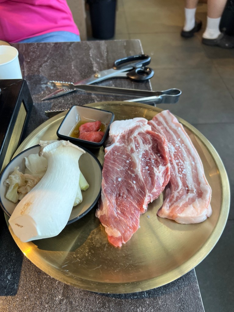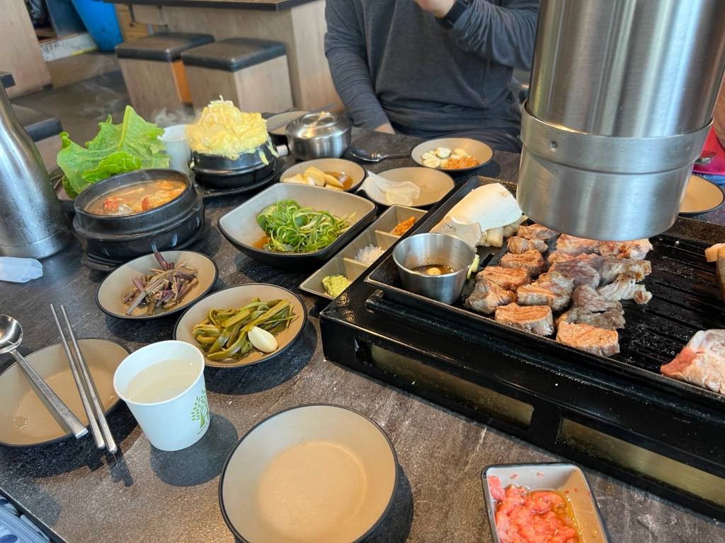 The tables have the hole in centre for coals and cooking, plus a drawer at one end for chopsticks, spoons and serviettes. We also shared a 375ml TWENTY ONE PERCENT alcohol bottle of Soju. Alex can’t partake as he is driving. This is a Jeju Soju (rice wine) and Alex explained that all Soju was once this percentage however some of the companies are now reducing the alcohol content as the young ones can’t handle/don’t like the other. So Jeju Soju is one of those keeping it traditional.