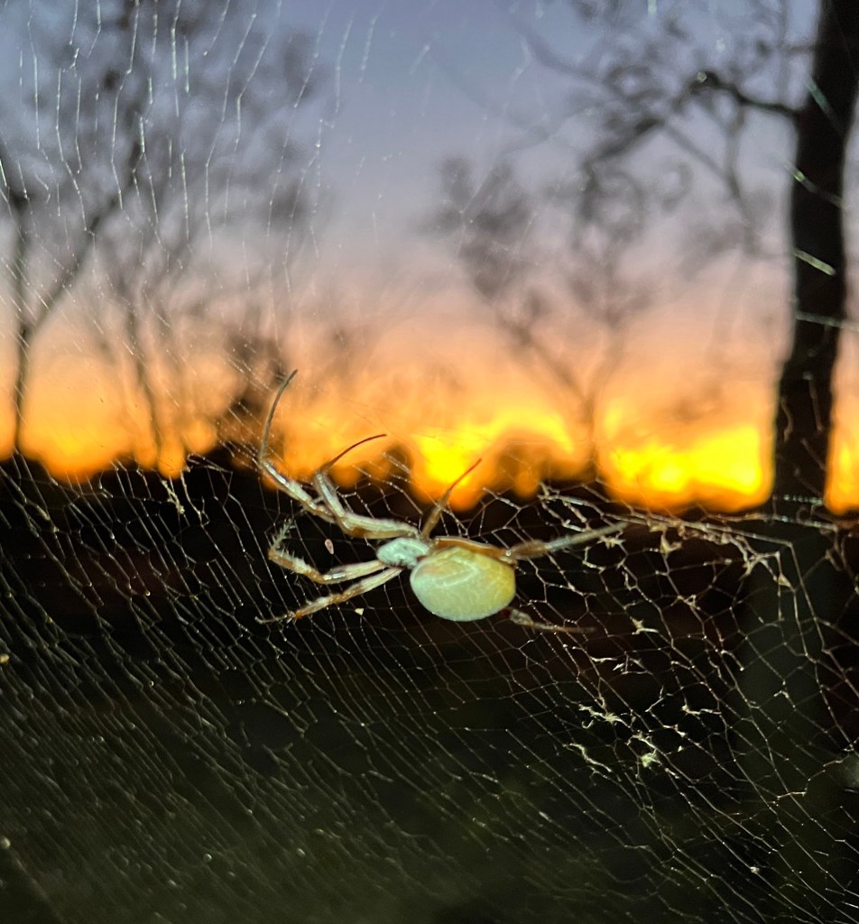 Awoke between 6 and 6:30. Up and dressed and went for a little walk out the back of camp. Ran into a spider web, I felt it across my chest – such a strong line of silk, backed away and it did not break. Found the web and took a pic of the maker.