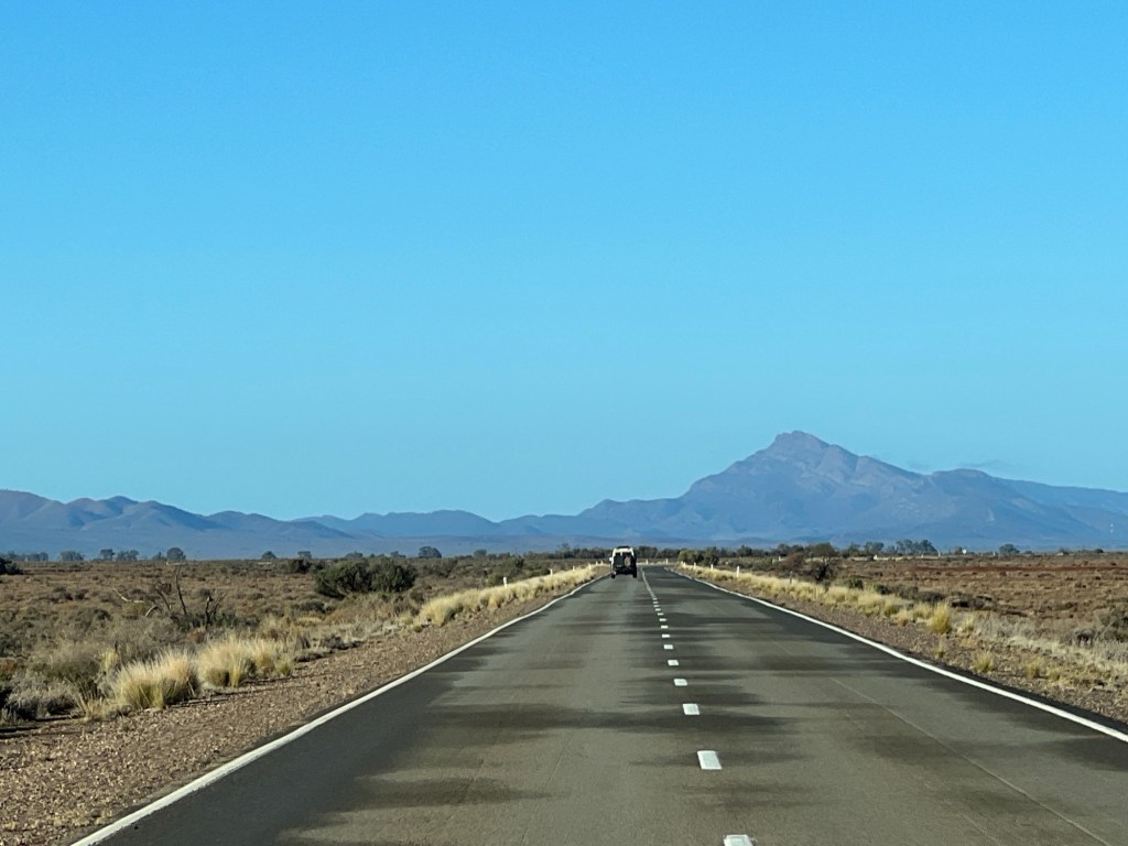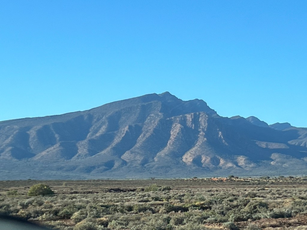 So ready to roll and out the school gate about 8:30. The sun shining on Flinders Ranges this morning really highlights their craggy rugged rocky composition.