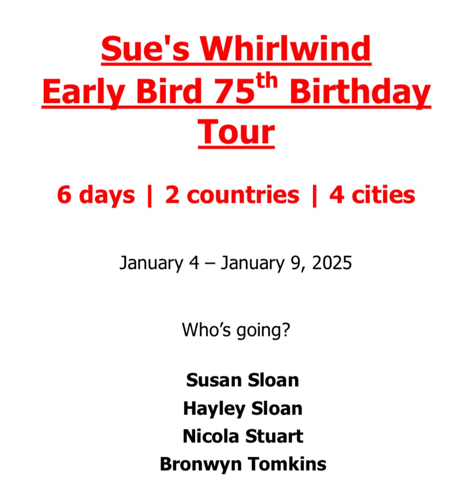 One response to “Suzie’s Whirlwind 75th Birthday Tour. January 4-9 2025.”