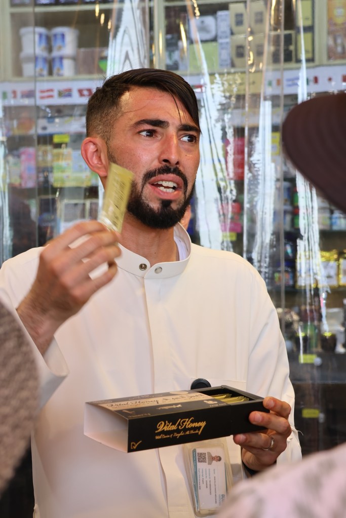 Hamza explained the properties and uses of a range of interesting spices, teas, and other stuff. Interesting but not retained by me. Real saffron will float in water, fake saffron is a deep yellow and sinks in water. There is a crystal menthol for colds/sinus etc, basically Vicks on steroids.