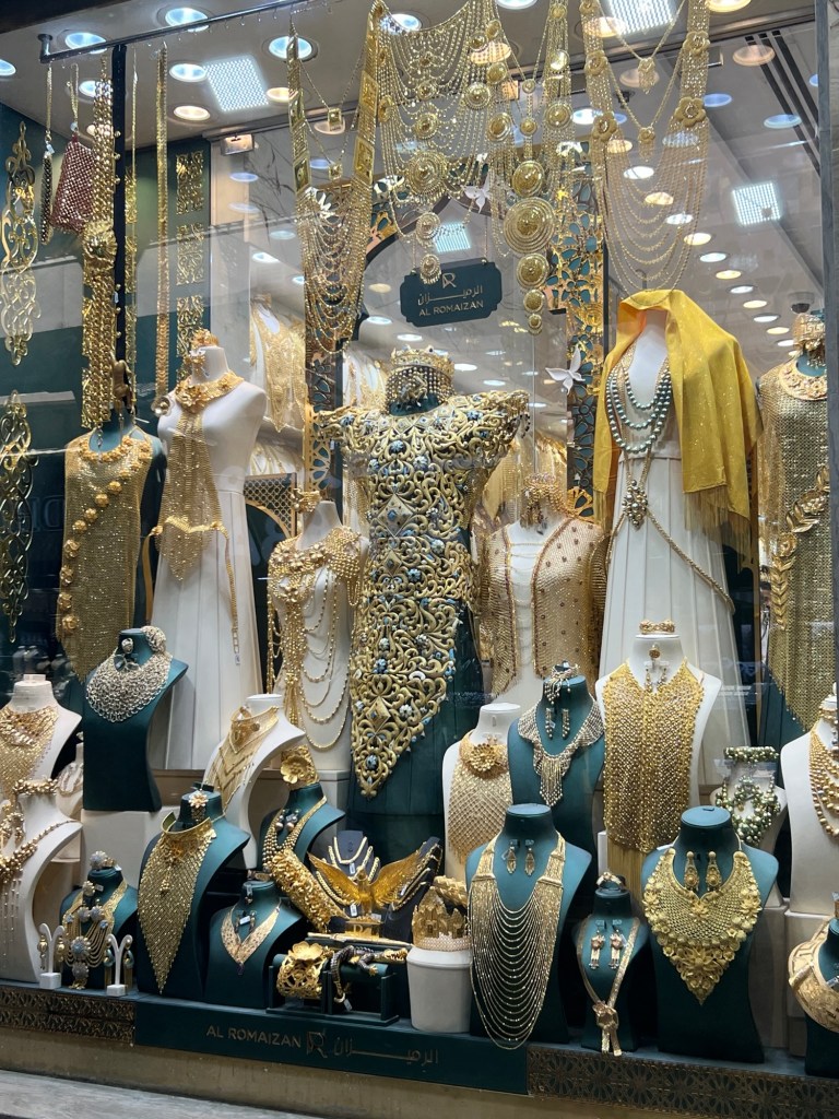 We also were given a white chocolate, almond filled date to try – very nice. Then we had about 20 minutes to wander around the spice and crap touristy stuff. The poor market sellers were out for a sale, we just walked on by and tried to take the odd photo. Off to the gold souk (market) next. They only sell 18, 22 and 24 carot gold. It’s so yellow and gaudy that it looks fake to me. Not my cuppa tea but the extravagance is overwhelming.