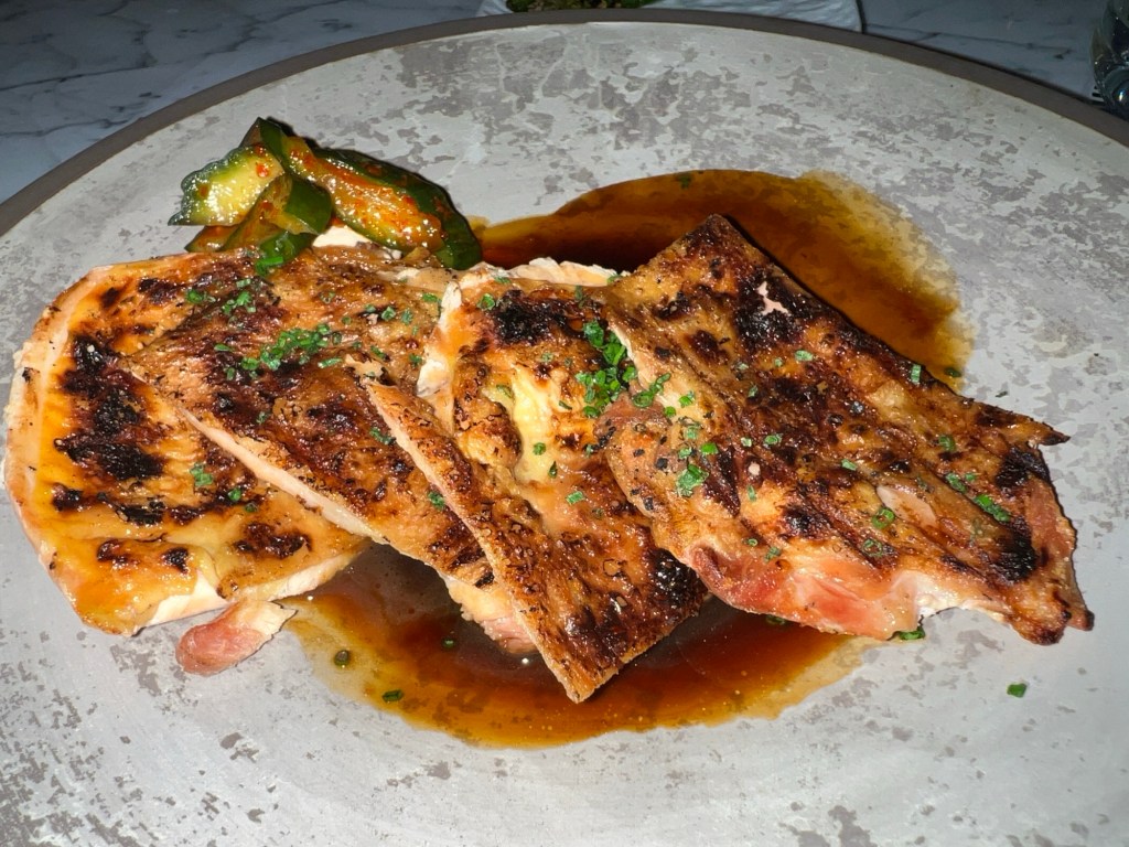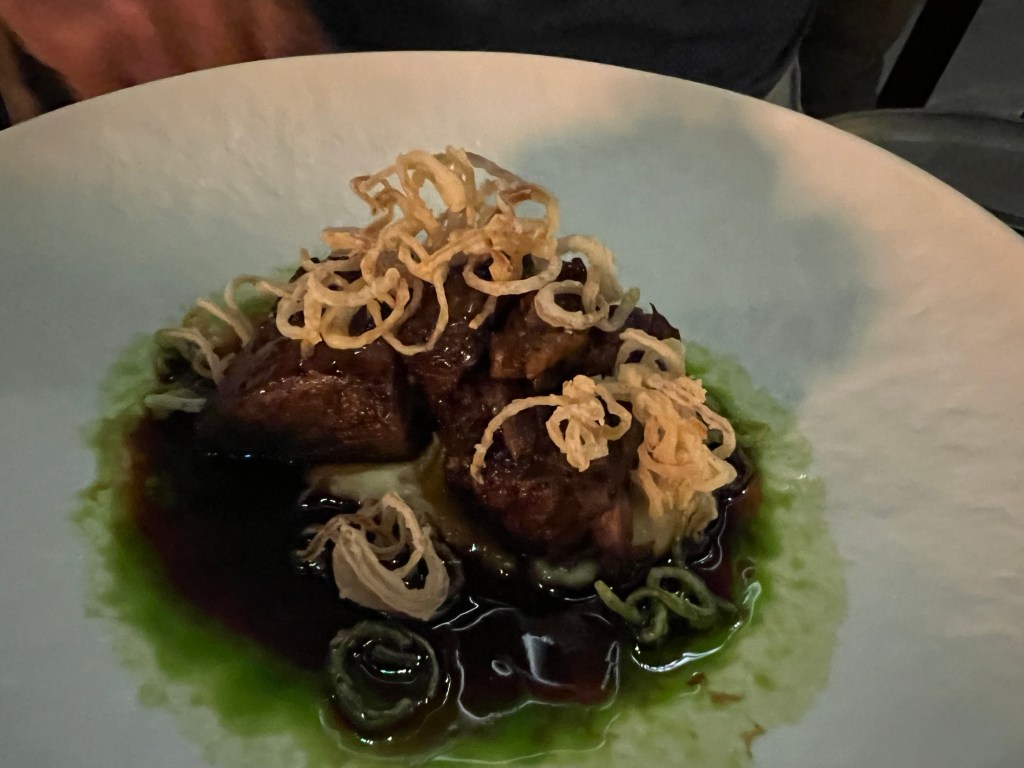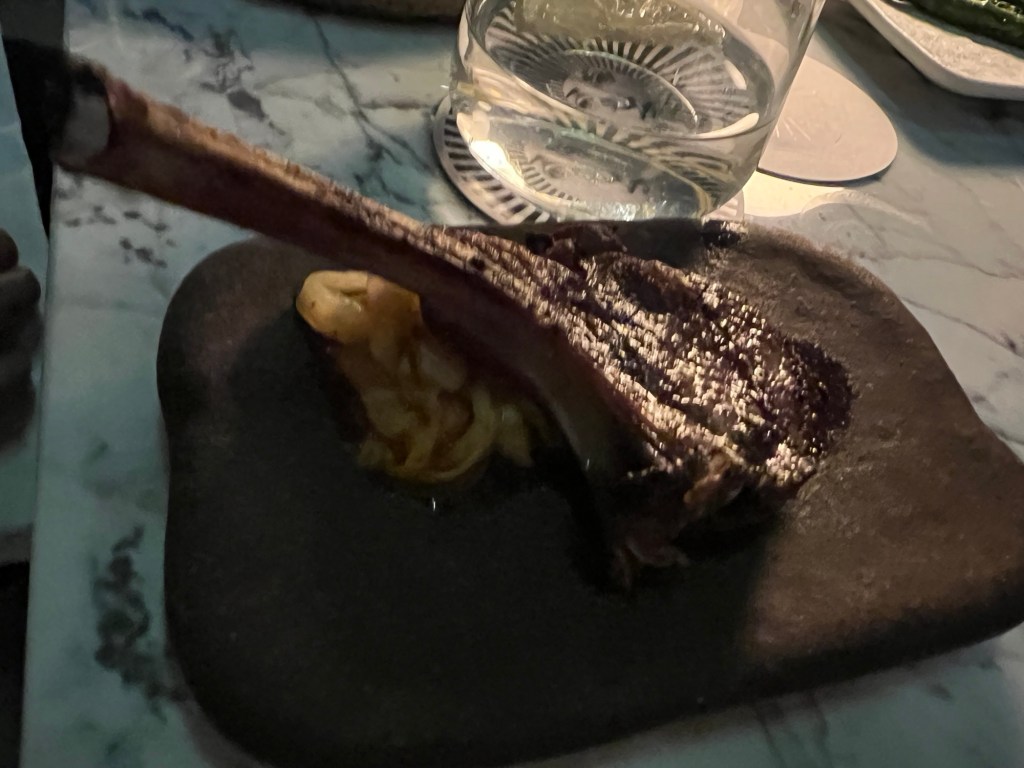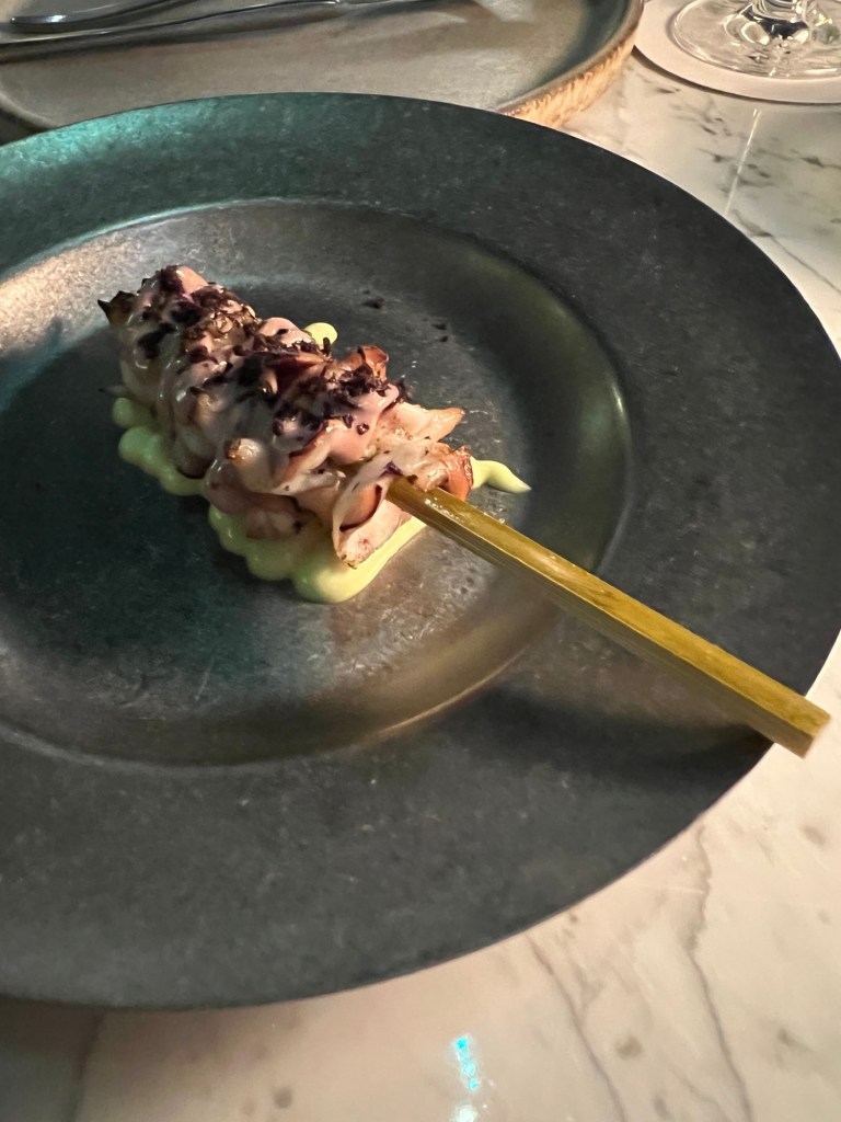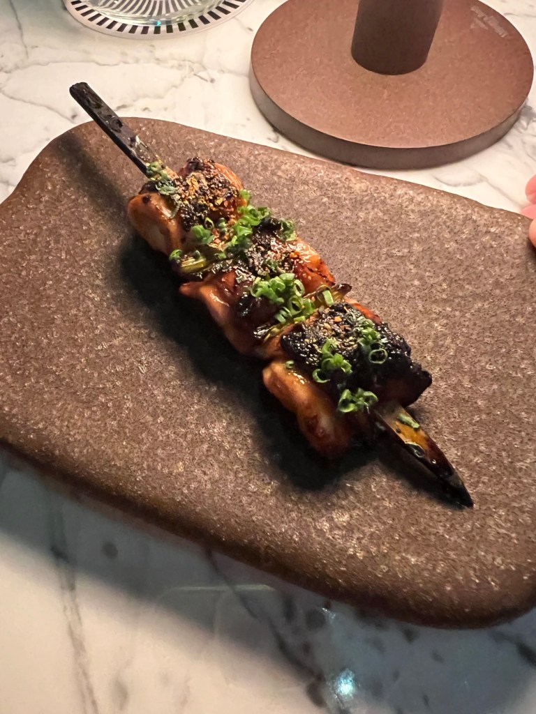 Suzie had a selection of skewers – octopus, chicken yakitori and a lamb chop. Mary had the gnocchi – with pesto, pistachio and something? Phil had wagyu beef.