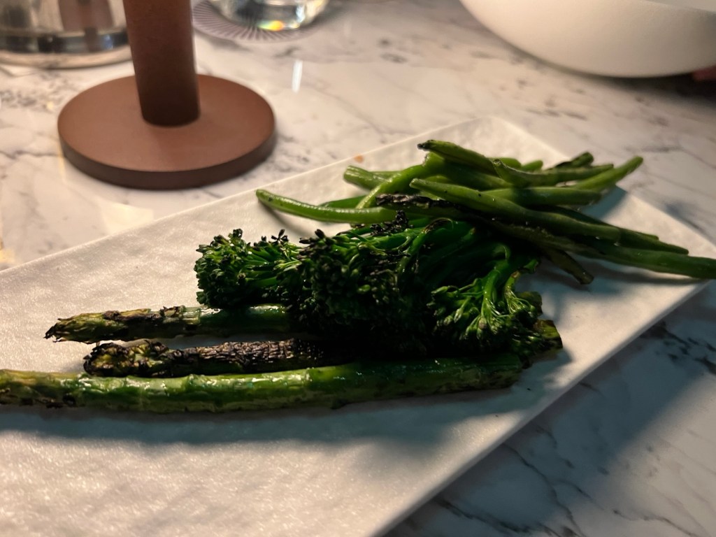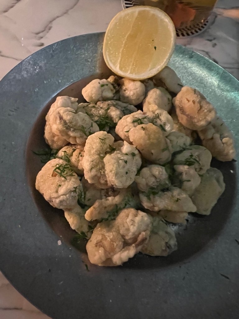 The food was amazing- really, really good. I had tempura mussels followed by corn fed baby chicken – it tasted sensational. We shared some charred garden greens and mashed potatoes- awesome.