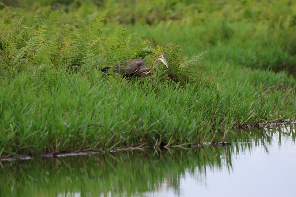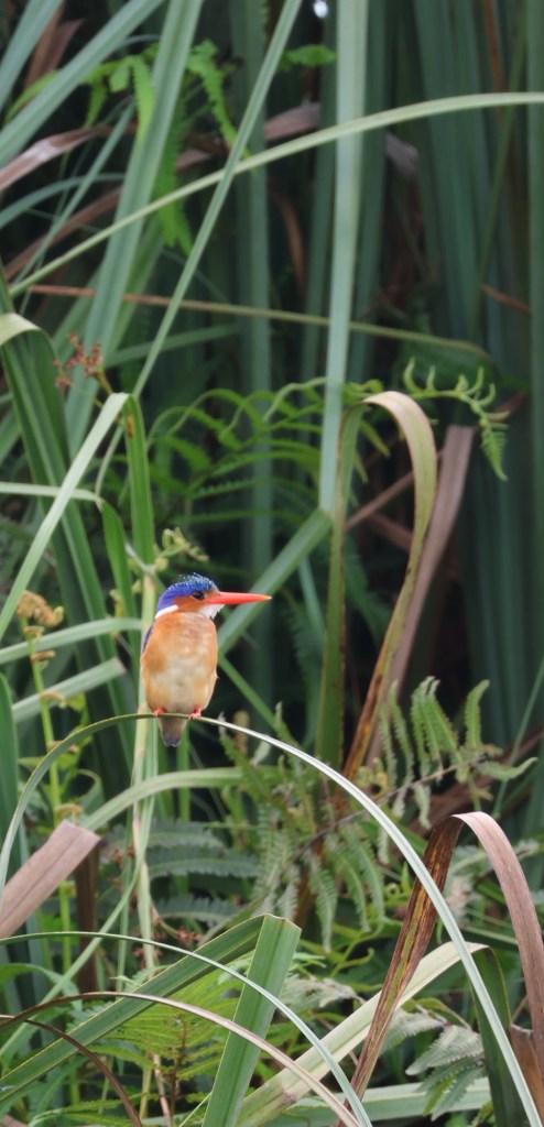 Then it leaned in again and we were so fortunate to actually see the Shoebill launch its head into the shallow water. It came up with something – at first we thought it was a large insect but our Captain had my binoculars and said it was a small tortoise. Whatever it was the bird seemed to struggle to get it down. (Suzie has researched since and this is usual behaviour) We were all hopeful of getting a good shot. I tried a video. We won’t really know till we get home to computers.