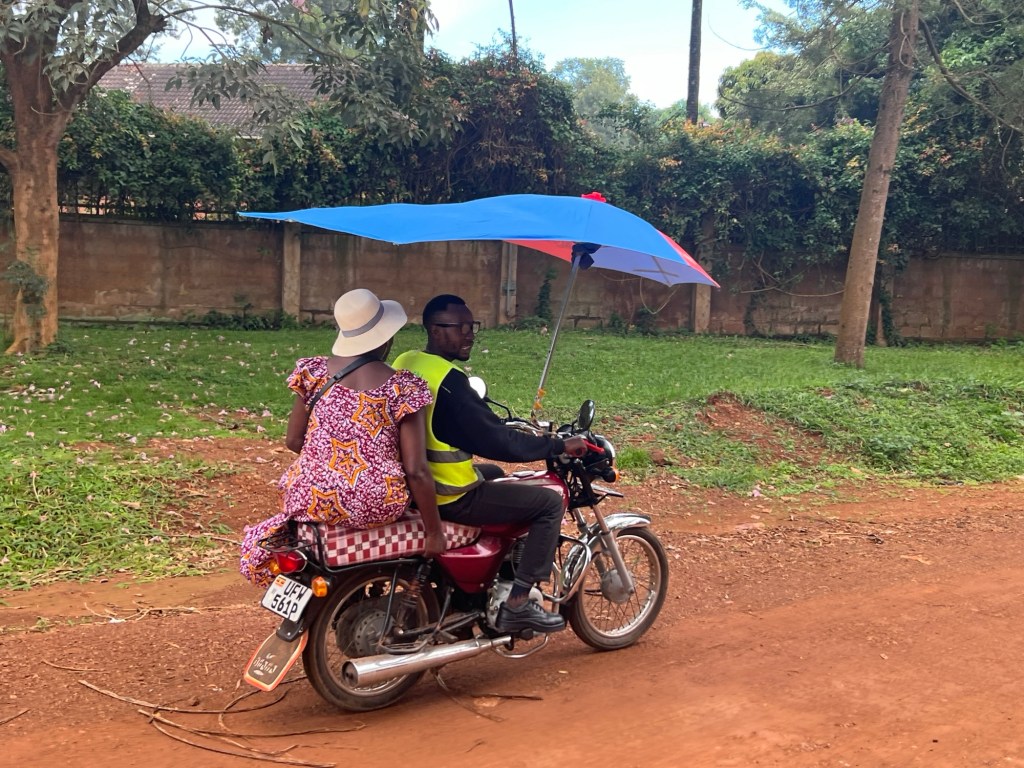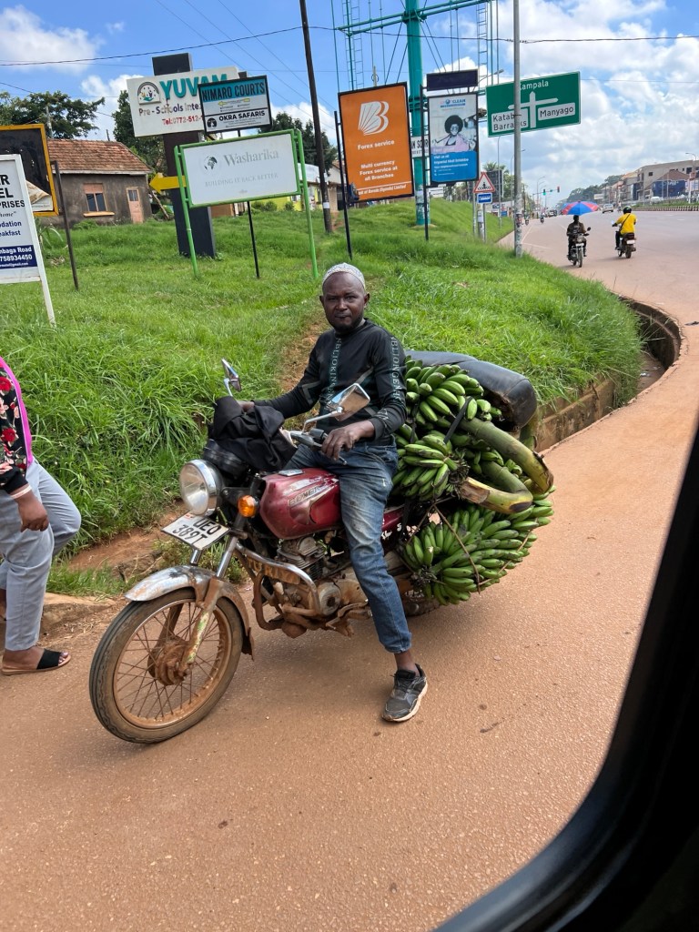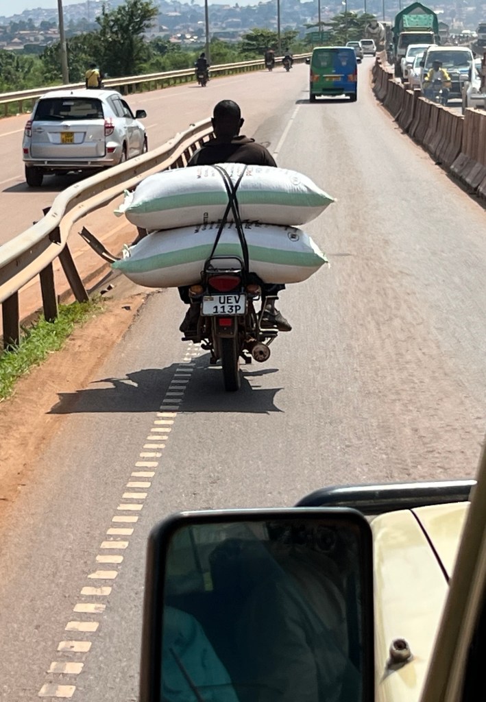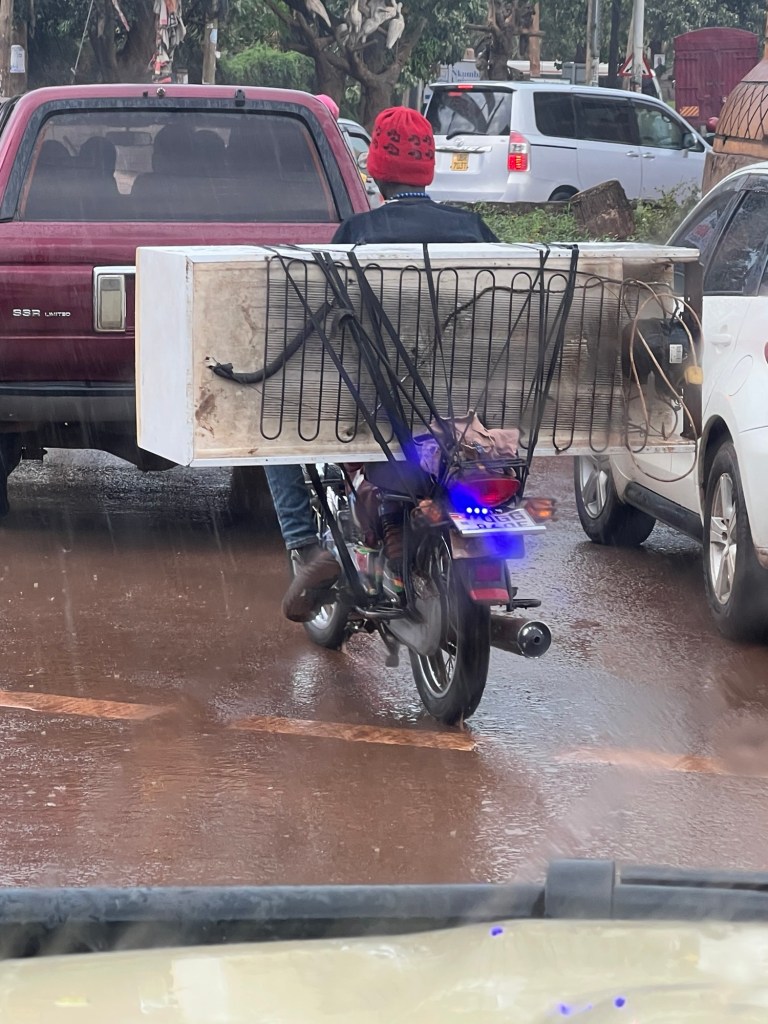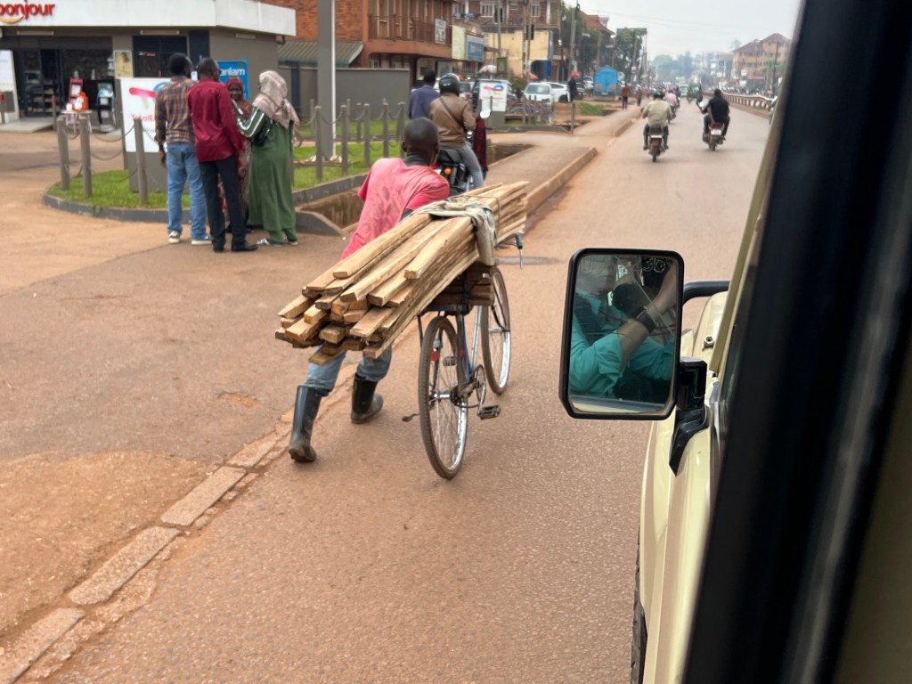 They carry so many things on the bodaboda or even push bikes. We saw a windscreen being held onto by the passenger, lengths of pipe, huge bags of stuff and even an office printer.