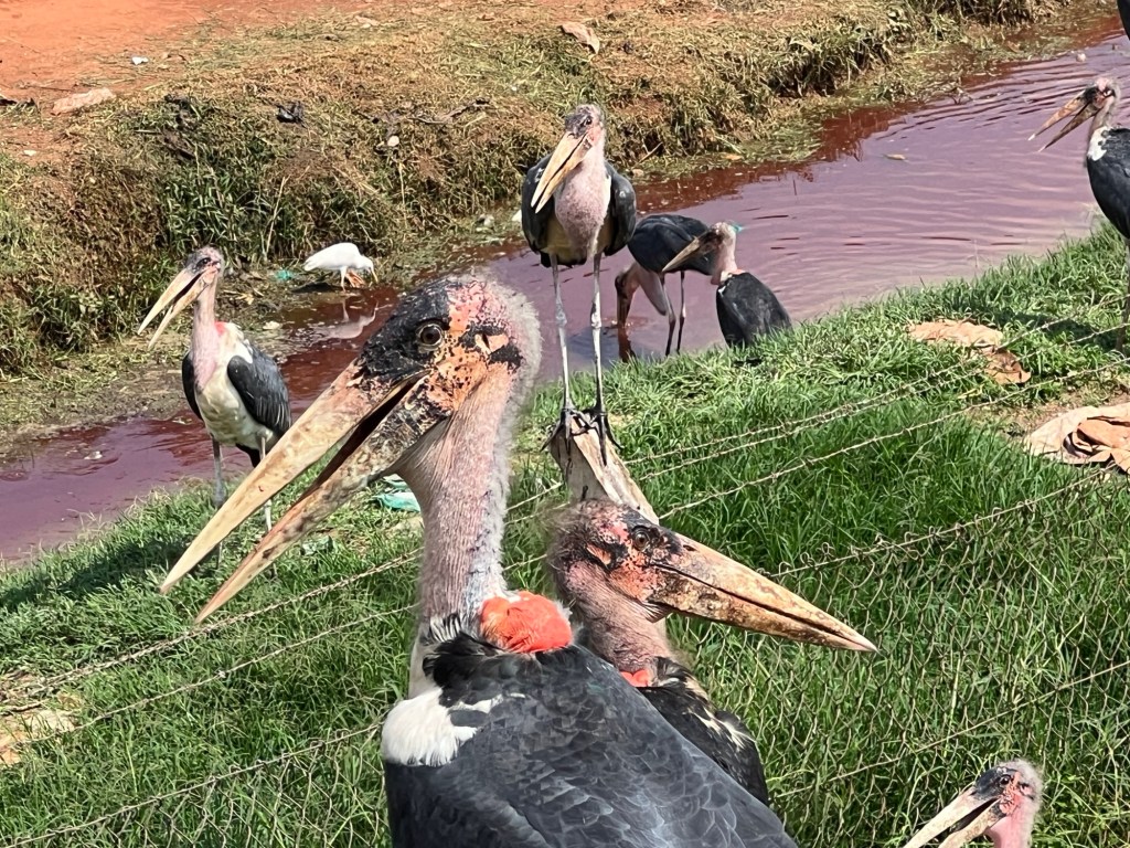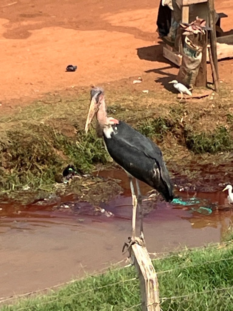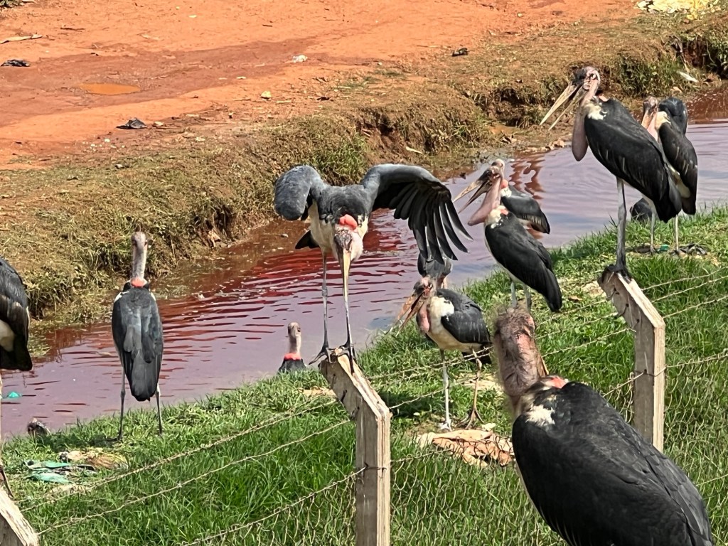 We passed by an abattoir which attracted the Storks, close to roadside with up close views. The red sac at back of neck and larger one on front are air sacs. Dorsal and ventral subcutaneous, dilatable air pouches play a part in the social life of the Marabou stork. Inflation of the ventral pouch indicates the dominance of an individual over its neighbours whilst inflation of the dorsal pouch indicates apprehension. Both are inflated simultaneously during courtship. thanks Google!