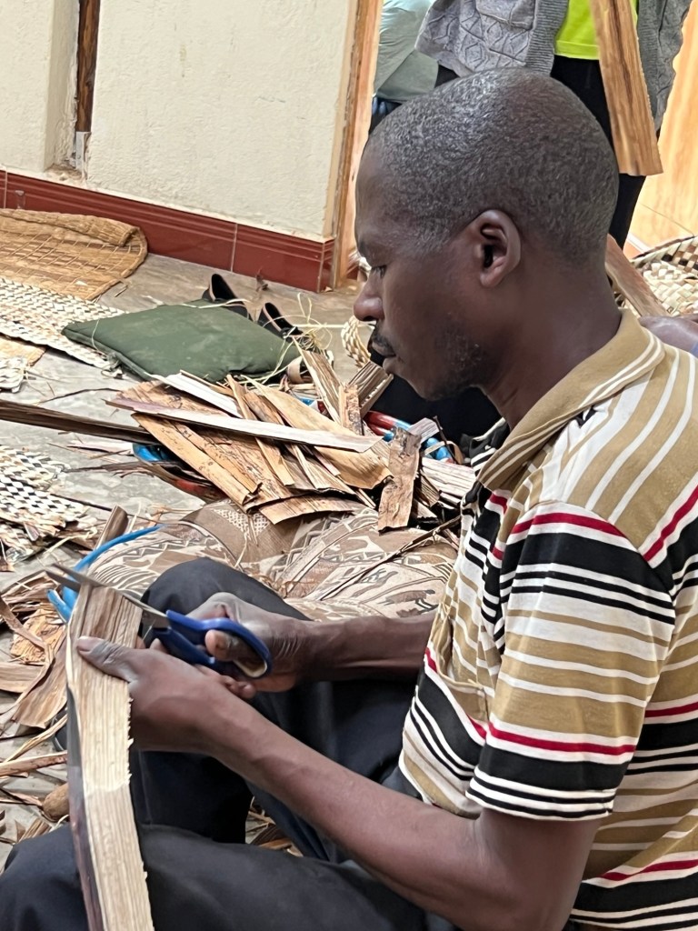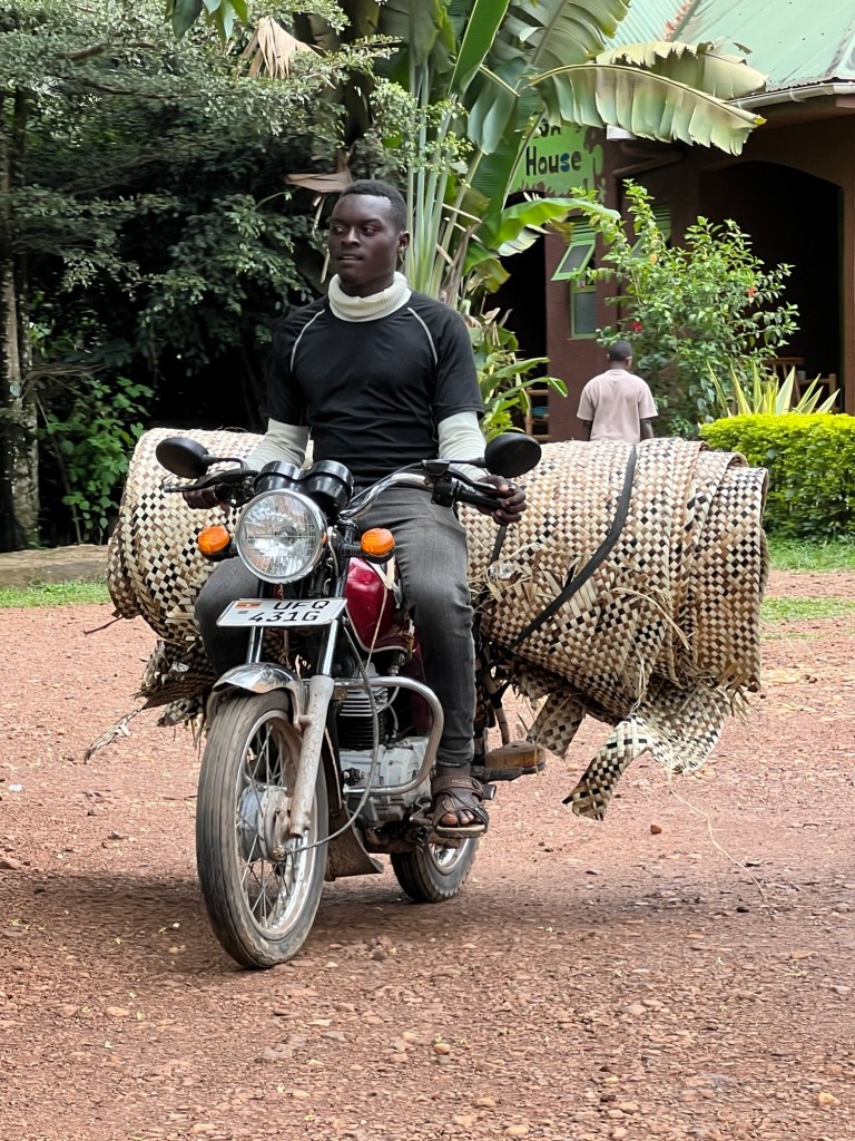 A local tourist lodge came to Eve to ask if the weavers could make mats for the ceiling of the lodge. So all the workers at Ride 4 a Woman have been turned over to mat making. They are working in three shifts to get through the massive job. The workers earn between $1.50-$2.50 a day. This is good money for them. Eve shared that the project won’t make money but the work for the people is high value. They are not yet half way finished. The ladies (mostly) and men were working till 10pm. The detail in the strips made from Banana leaves is incredible and then these are joined lengthways to make a mat. Somehow they will be on the ceiling. The photos don’t do it justice.