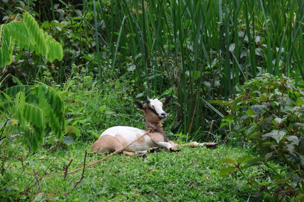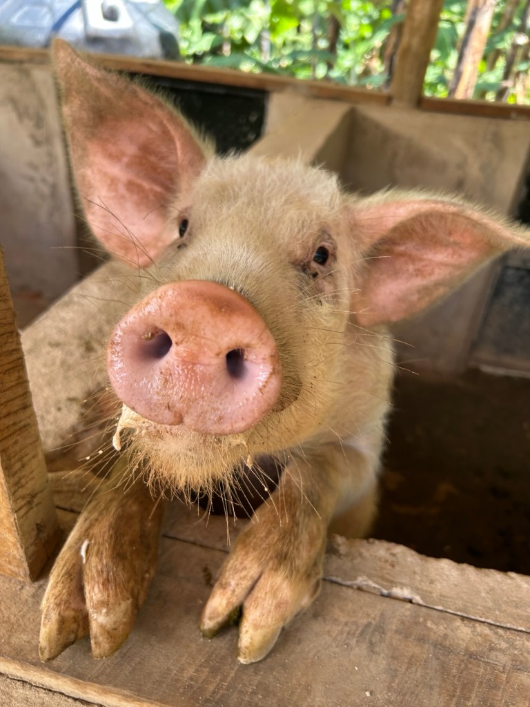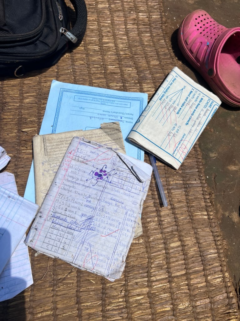 We passed women drying coffee beans, walked through banana farms, visited a small pig project where they are breeding the pigs. This man had 6 pigs. There is a lot of work going on to support the community to work and plan for the future eg. To breed a pig means within 3 months you have many pigs, some to eat, some to sell. Rather than killing to eat or sell only once. At the pig project there were three young girls who gave Gerald a big hug and then us. They were home from school for Easter and the older one had her school books out. All schooling is in English.