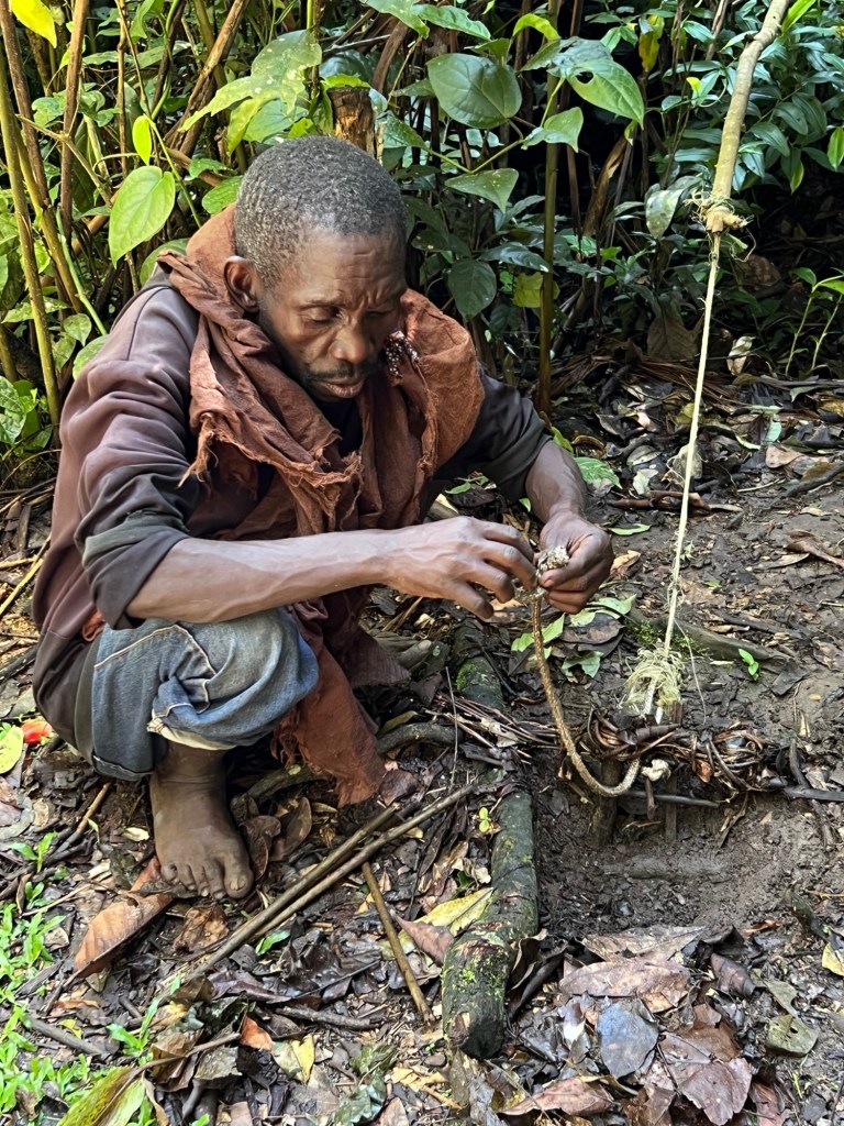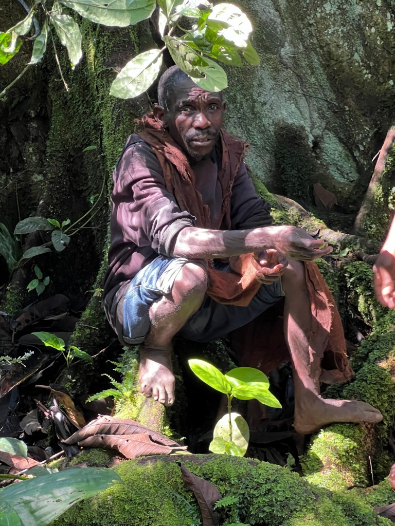 We walked a short distance down the road and into a patch of forest. Here Gerald literally called out “Francis” a few times. Francis and his family appeared from the forest. They are our Batwa guides.