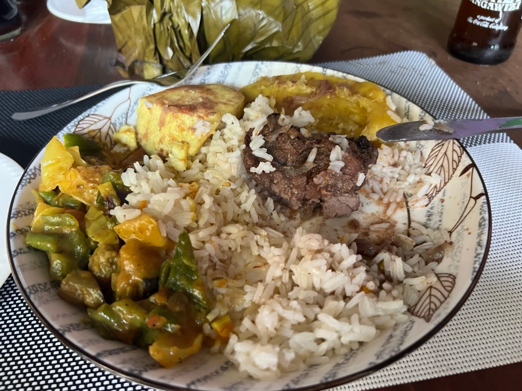 The goat was tasty but tough. The vegetables were super amazing and the plantain too. The juice/soup that Mary’s chicken (a nod to Good Friday for our lapse Catholic) was in was delicious over the rice.