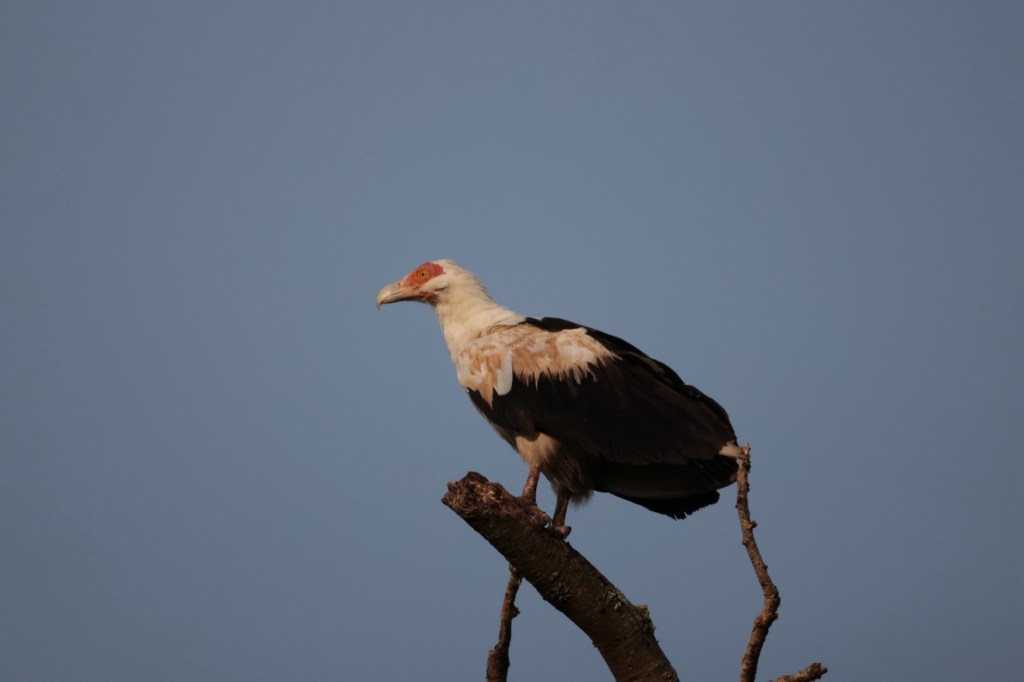 Out onto main road. Saw another Palmnut Vulture flying in front with distinctive white wingtips. It landed for a better picture than yesterday.