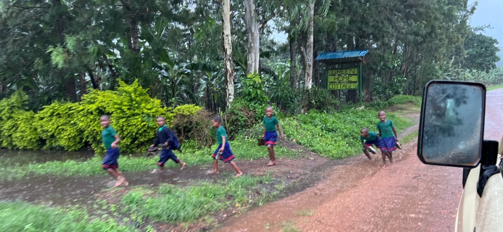 School in the rain with absolute torrents running down the roadsides.