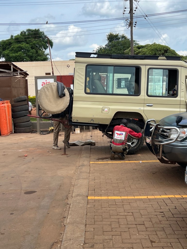 Wilson pulled into fill the tank, only to find we had a quickly deflating tyre. The servo had no air and it was too flat to drive around the block to tyre repair. So unloaded the luggage to access the tools, off with the spare and high lift jack and put on the spare. Repacked the luggage and off around around the block to repair the flat and replace on truck. A hot bit of work for Wilson. We helped where we could, but he was determined to do it. While at the Total Service station, Suzie and I checked out the pharmacy and bakery and the little supermarket at the servo.