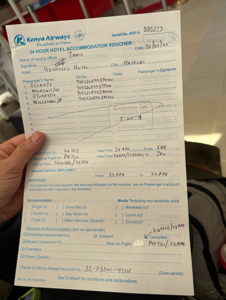 We were getting antsy when our man Fred indicated he would go upstairs and see what was going on. He phoned his colleague who advised we had our flights and we should check our luggage and proceed through immigration and second security. Ironically, the flight they have checked us into is from our original itinerary, it departs Nairobi at 7:35 this evening. They have also arranged some accommodation for us at Nairobi Airport and a voucher for drink and snack at the Crane Cafeteria – big whoop!!!
