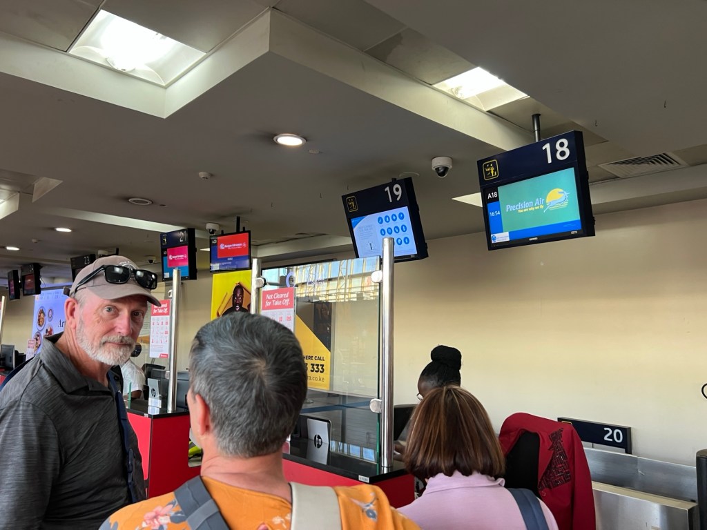 Eventually there was no one left in the Kenya Airlines check in line. Fred (our check in man) had come to update us twice and another woman once indicating that Kenya Air staff upstairs were arranging our new onwards flight from Nairobi to Kilimanjaro Airport in Arusha, Tanzania.