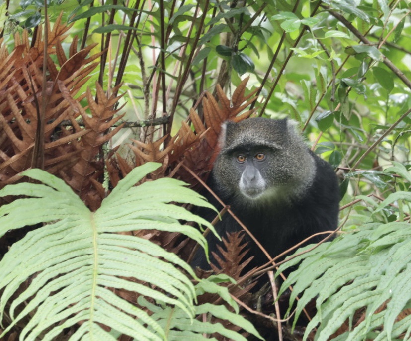 Some very hard to see Black and White Colobus monkeys with a couple of Blue Monkeys.
