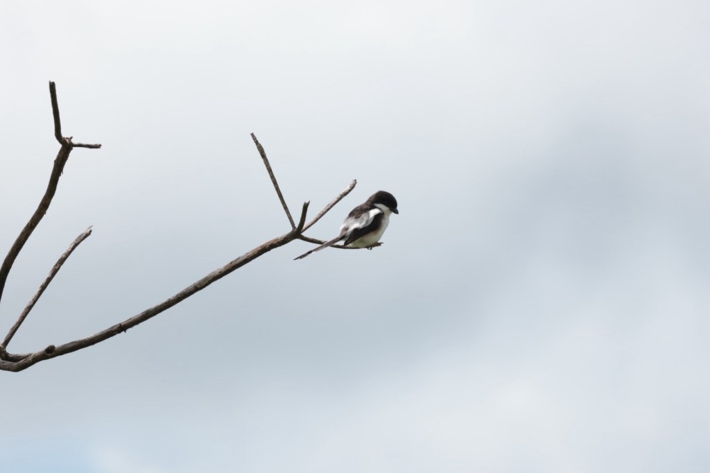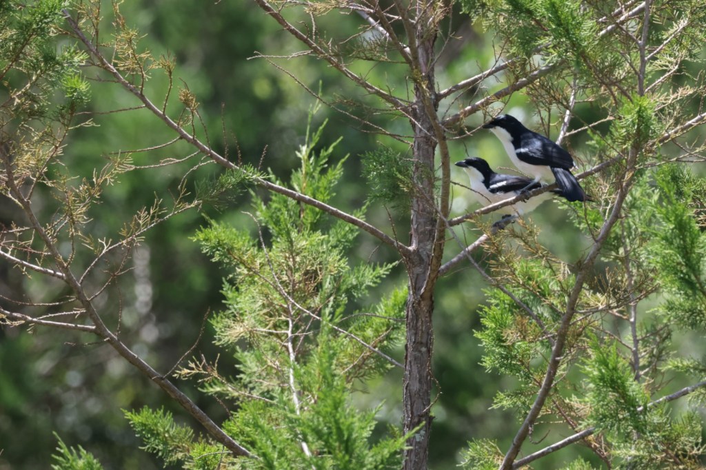 Tropical Boubou bird. A clicking call like two sticks and then a bell like call when they bob their heads.