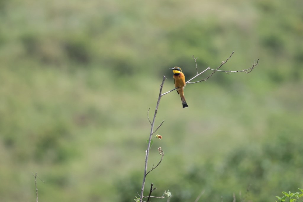 Heaps of Tree Agama lizards running around. There are giraffes on the hills to the left and right. Waterbuck, birds.