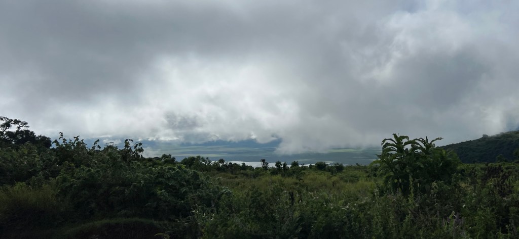 A rainy start to the day and clouds are low and we are up in them, unfortunately impeding the view over the crater from the rim. It’s also cooler today – time for a long sleeved T shirt.