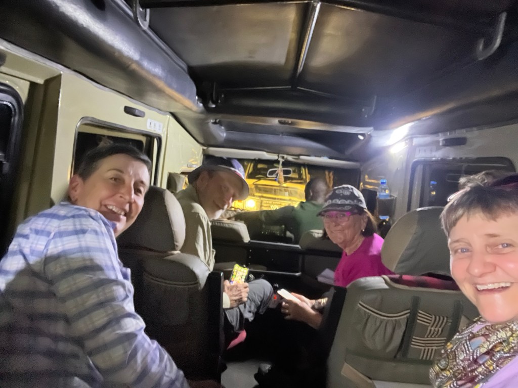 What a magical day. Despite a late arrival into the lodge, we got a bonus sunset and golden hour. But we got more than we bargained for. A few kilometres down the track the vehicle started to fail (6:20pm). Something wrong with the fuel pump we think. (6:30pm) It gave up the ghost and Phil and JB tried to pump the fuel pump. At one point JB had service and phoned someone as we sputtered along. Once it had stopped and couldn’t restart (starved of fuel) we saw sunsetting from the vehicle while Phil and JB continued to problem solve under the bonnet. As the darkness fell I saw a shape moving about 15m away on Mary’s side we both thought Hyena shape so let the boys know.