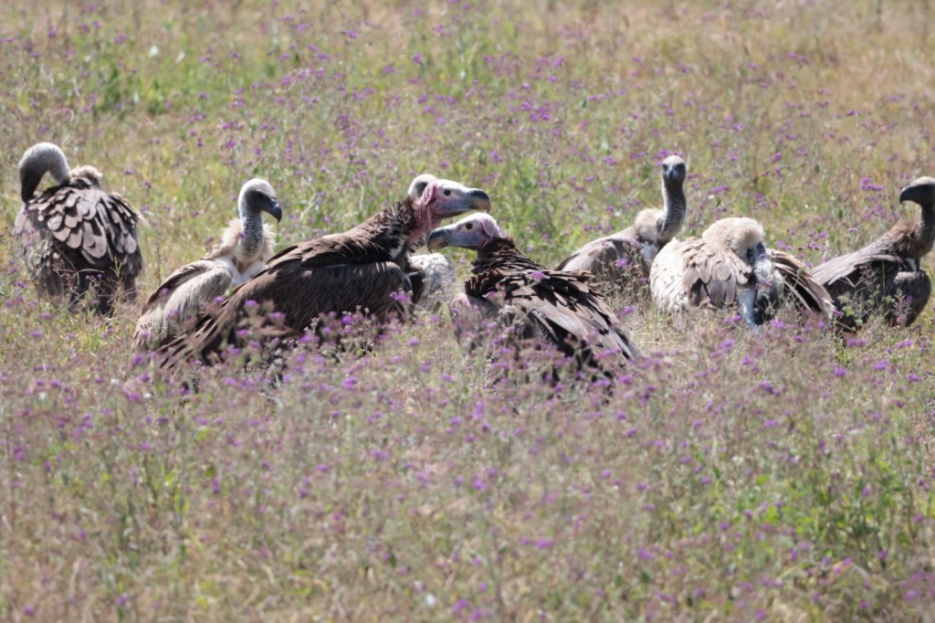 Lappet Vultures among the African white backed vultures and Maribou Storks.